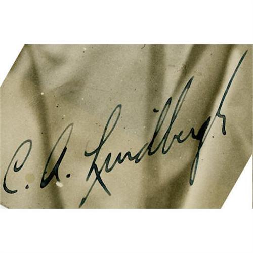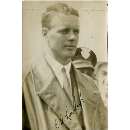 <B>Charles Lindbergh Photograph Signed</B></I> <I>C.A. Lindbergh.</B></I> This 5.25" x 7.8" photograph features America's favorite flyboy, Charles Lindbergh! He is wearing a suit and tie, and looking slightly off camera. His signature is in fountain pen, and is dark and clear. The image itself is in good condition; it is slightly fuzzy with a few imperfections on the face of the photo. There are two strips of toning differences: one on the top of the image, and one on the bottom. And finally, there is a small tear in the photo near Lindbergh's tie. Lindbergh became the premiere spokesman for aviation, and America's darling, when he successfully flew solo across the Atlantic Ocean. Capture this photograph today, and own a picture of the man who meant so much to this country, and to the industry of aviation!
