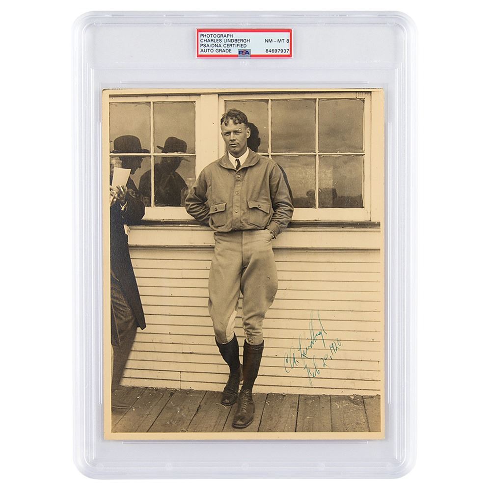 Vintage matte-finish 8 x 10 photo of Charles Lindbergh outside Louie& rsquo;s Lunch Room at Lambert Field, St. Louis, on May 11, 1927& mdash;just before his historic New York-to-Paris flight& mdash;nicely signed in fountain pen, "C. A. Lindbergh, Feb. 20, 1928." Reverse bears the credit stamp of Mario Cavagnaro, a photographer who worked for the St. Louis Star. In fine condition, with faint silvering to darker areas of the image. Encapsulated and graded by PSA/DNA as "NM-MT 8."