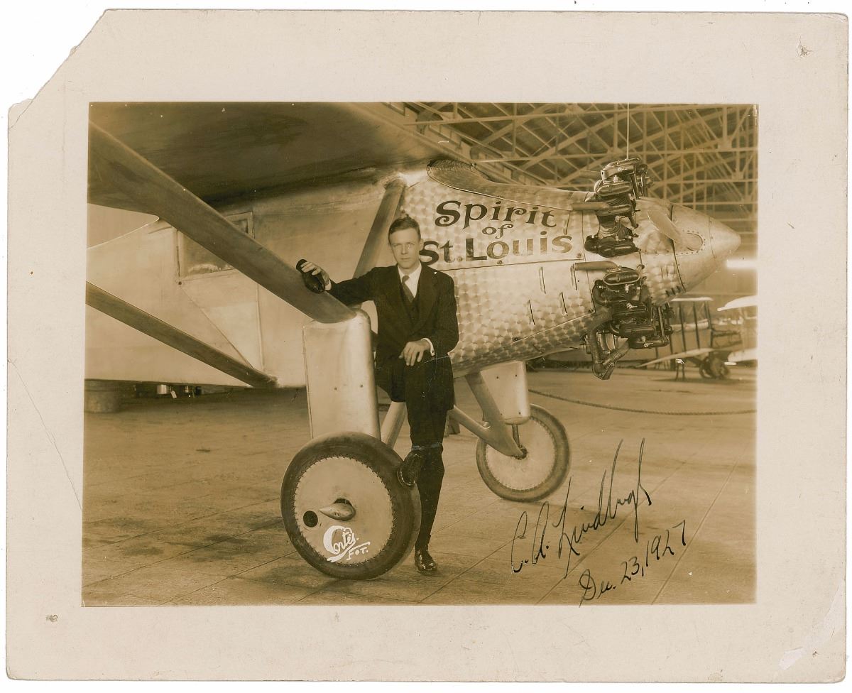 Superlative vintage sepia pearl-finish 10 x 8 photo of Lindbergh clad in a suit and tie and posing with the Spirit of St. Louis in a hangar at the Mexican military base Balbuena, signed in fountain pen, “C. A. Lindbergh, Dec. 23, 1927.” In very good to fine condition, with absent top left corner, a single tack hole to each remaining corner, and a diagonal crease to left border; perimeter flaws could be easily matted out, and the signature itself remains bold and unaffected.