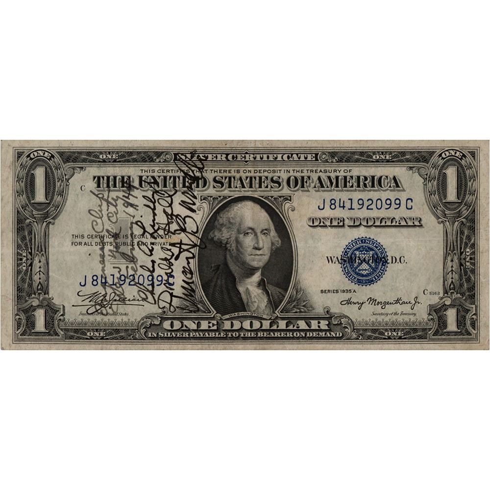 Series 1935 A 'short snorter' one dollar silver certificate, signed vertically to the left of Washington's portrait in fountain pen, "Charles A. Lindbergh." The banknote is also signed by Donald A. Hall, a pioneering aeronautical engineer who designed the Spirit of St. Louis, and by Vincent Burnelli, an aeronautics engineer who was instrumental in furthering the lifting body and flying wing concept. Another hand has added above the Lindbergh autograph: “Engineers Club, New York City, February 1944.†In fine condition.