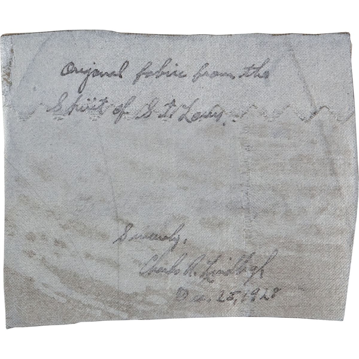 Exceptionally rare piece of fabric from the Spirit of St. Louis, signed by the aircraft's chaperone to Paris, Charles Lindbergh. Upon the 3.25'' x 2.75'' piece of fabric, Lindbergh writes ''Original fabric from the Spirit of St. Louis. Sincerely, Charles A. Lindbergh / Dec. 25, 1928''. This piece of silver, stiffened fabric was treated at the time of its manufacture, and therefore likely taken from the fuselage area of the plane. Especially made by Ryan Airlines in 1926 for Charles Lindbergh's transatlantic flight, the Spirit of St. Louis was a highly experimental aircraft in its time, with its single-engine design, which Lindbergh believed would optimize his chance of success. As tradeoffs, however, the engine tank was situated at the front to improve the center of gravity (denying Lindbergh a front windshield) and the fuel capacity of the plane was dangerously low. Lindbergh, in fact, was so concerned with losing fuel from the weight of the plane that he trimmed excess paper from his maps. This piece of fabric from the spectacular and revolutionary aircraft was removed after Lindbergh flew The Spirit on its final flight from St. Louis to the Smithsonian Institution in Washington, D.C., in April 1928, where it still resides. There, at the Smithsonian, it was renovated and this piece of the plane's fabric was saved and, on Christmas, 1928 signed and given to only a select few individuals close to the courageous aviator. Very good.