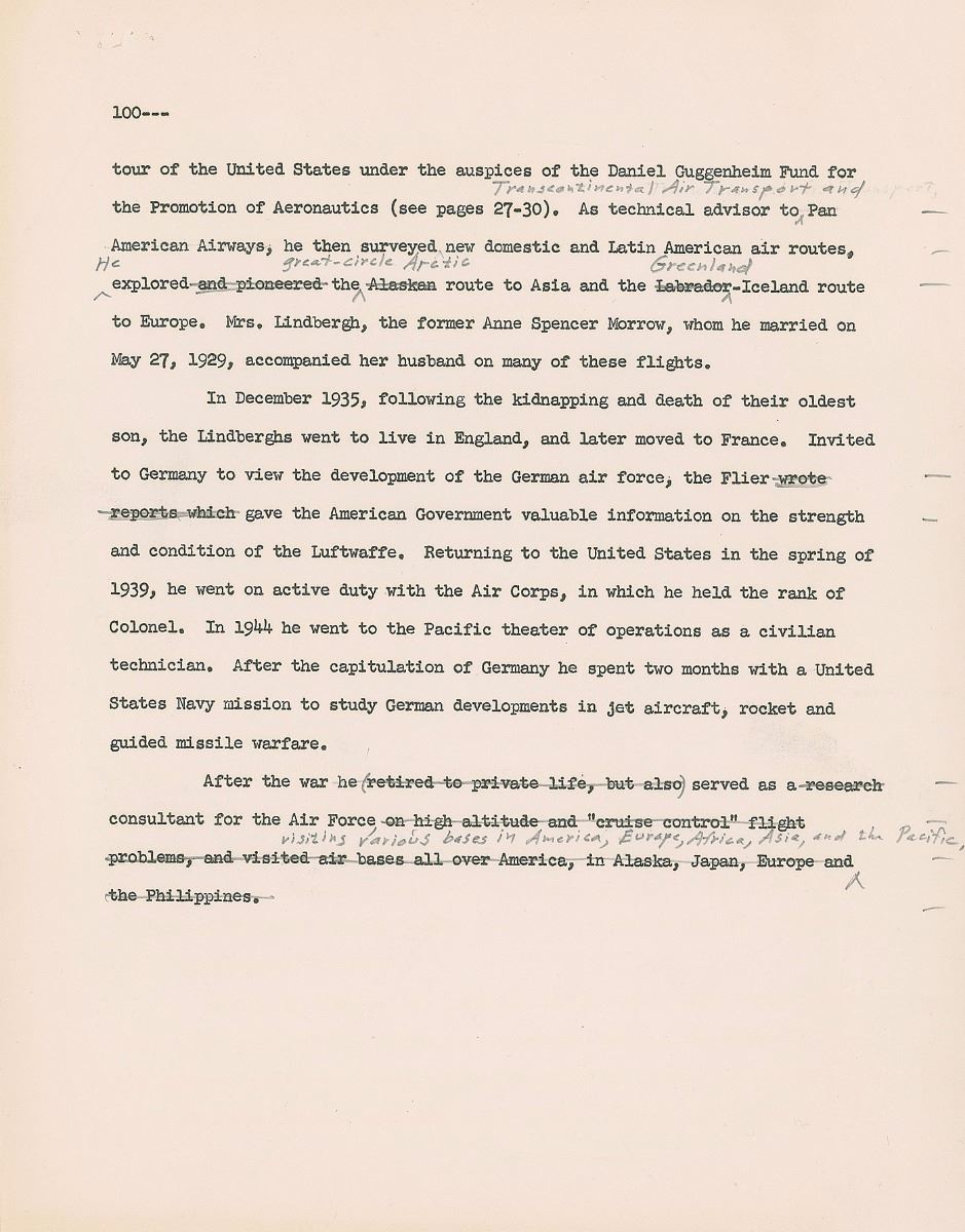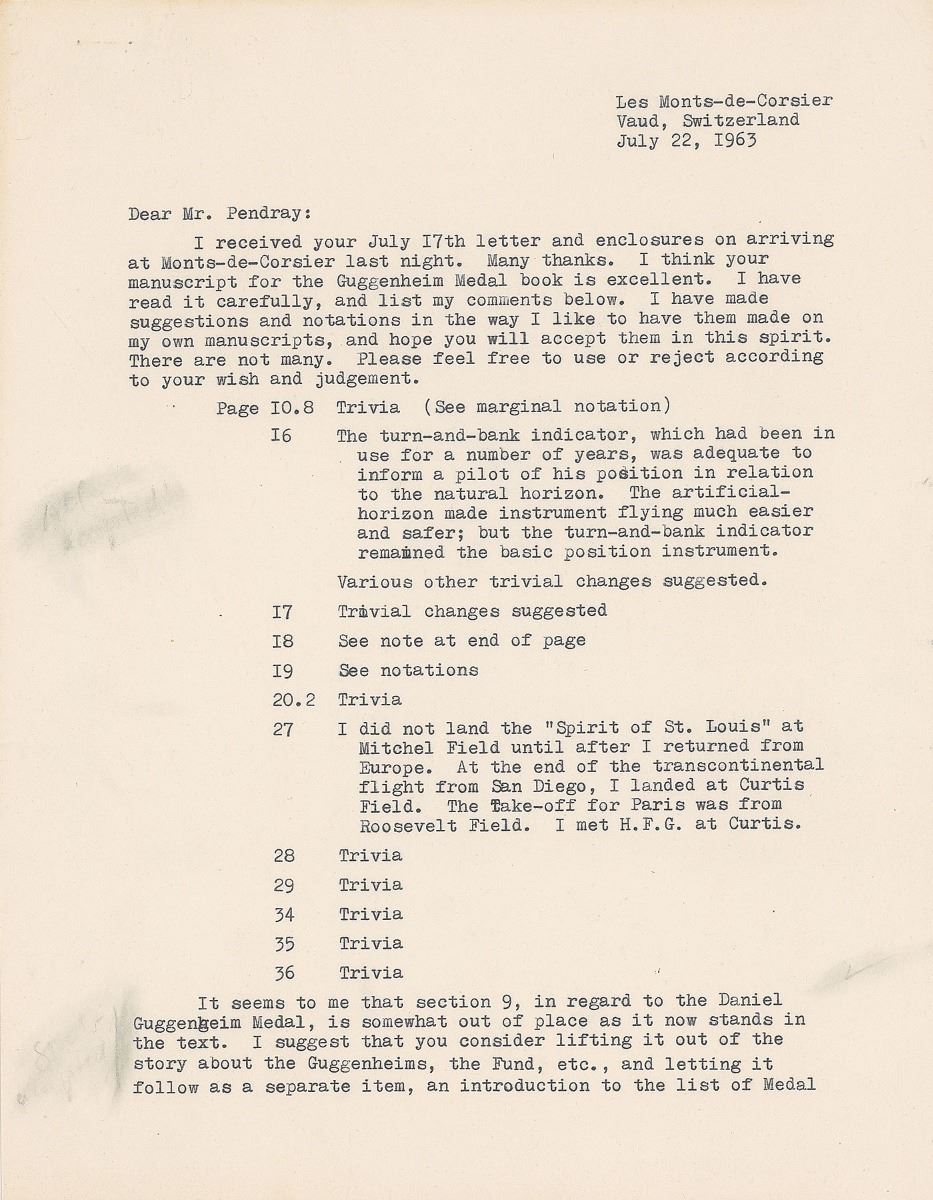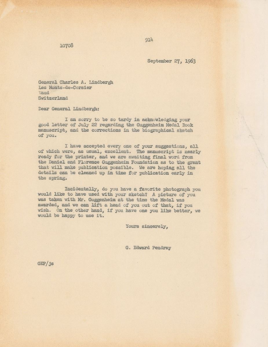 TLS signed “Charles A. Lindbergh,” three pages, 8.5 x 11, July 22, 1963. Letter to G. Edward Pendray regarding the book The Guggenheim Medalists: Architects of the Age of Flight, edited by Pendray and published in 1964. In part: “I think your manuscript for the Guggenheim Medal book is excellent. I have read it carefully, and list my comments below…As to my own biography, I find this a somewhat difficult problem. It is easy enough to list certain facts and accomplishments, but usually they don't seem to me the most important elements of life—boring as a 'Who's Who.' If I had to write a biographical sketch in 480 words (or more or less), I'd probably be working on it for weeks between the writing and the deciding. It's hard to compress life, except superficially…My suggestions and comments relate only to points of accuracy…I left the University in my sophomore year, about two weeks before I would have been kicked out for low marks and lack of regular attendance.