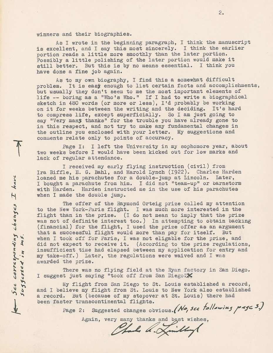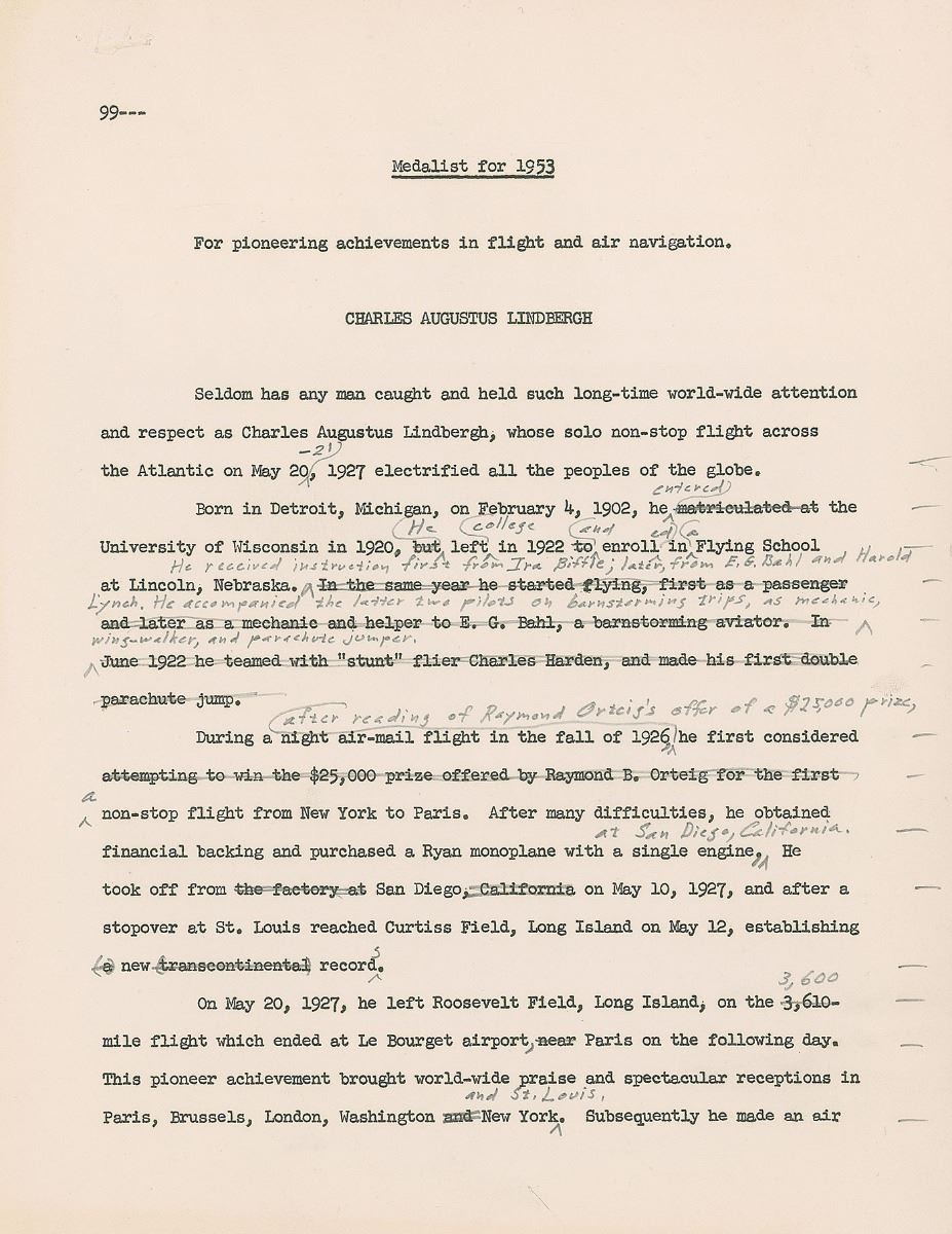Included is the two-page high-quality master copy of Pendray’s typed manuscript Lindbergh was returning, entitled “Medalist for 1953,” which the famed aviator meticulously hand-corrected in pencil. The most substantial correction comes in the second paragraph, which Lindbergh has crossed out and rewritten, in part: “He received instruction first from Ira Biffle; later, from E. G. Bahl and Harold Lynch. He accompanied the latter two pilots on barnstorming trips, as mechanic, wing-walker, and parachute jumper.” In the section on his transcontinental flight, Lindbergh amends the wording from “attempting to win the $25,000 prize offered by Raymond B. Orteig” to “after reading of Raymond Orteig’s offer,” to make the distinction he outlines in his letter.