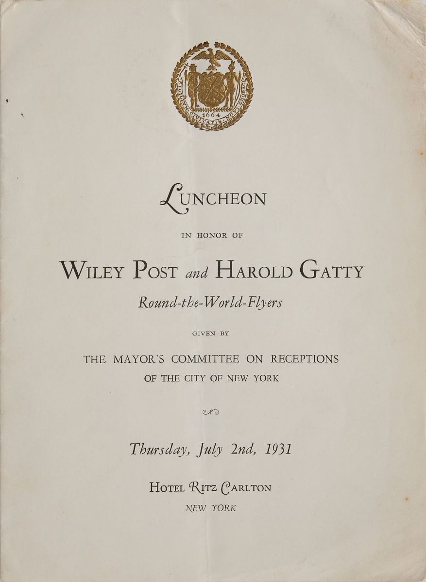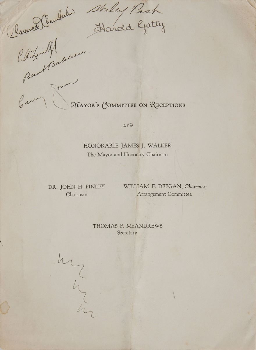 Program for a luncheon given in honor of Wiley Post and Harold Gatty by the Mayor’s Committee on Receptions of the City of New York at the Hotel Ritz Carlton on July 2, 1931, 6.5 x 8.75, signed on the back cover in black ink, “C. A. Lindbergh,” “Wiley Post,” “Harold Gatty,” “Bernt Balchen,” “Clarence D. Chamberlin,” and “Casey Jones.” In very good to fine condition, with light creasing and handling wear, and light soiling along a central vertical fold.