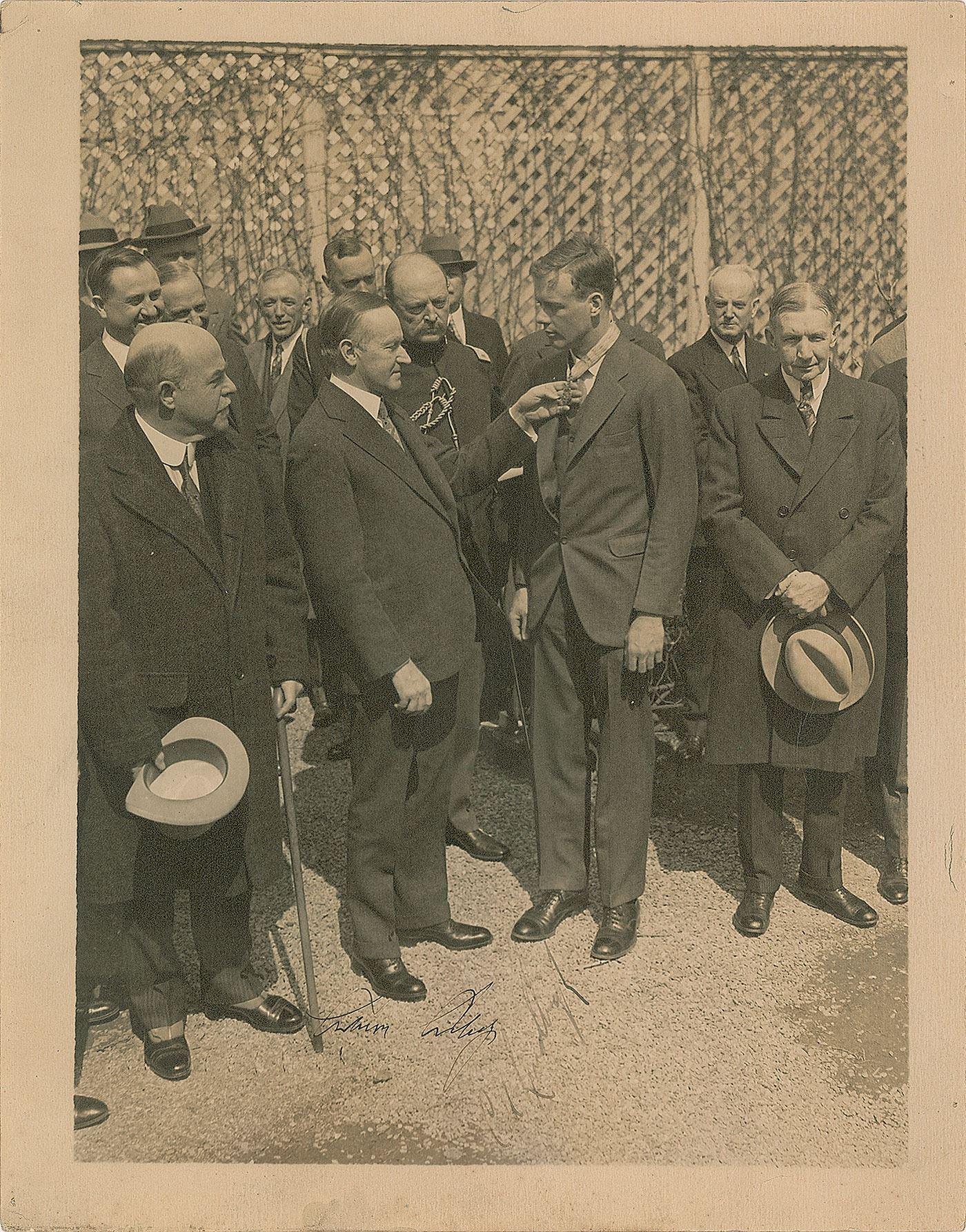 Unique matte-finish 11 x 14 photo of President Calvin Coolidge awarding Charles Lindbergh with the Medal of Honor after the aviator's heroic return to the United States in 1927, signed in fountain pen by both, "Calvin Coolidge" and "C. A. Lindbergh." In fine condition, with pin holes and soiling to the borders, and Lindbergh's signature faded but fully legible. While the esteemed award is typically reserved for Americans who exhibit military valor, Congress passed a special act to award Lindbergh with the Medal of Honor, issuing the citation: 'For displaying heroic courage and skill as a navigator, at the risk of his life, by his nonstop flight in his airplane, the "Spirit of St. Louis," from New York City to Paris, France, 20–21 May 1927, by which Capt. Lindbergh not only achieved the greatest individual triumph of any American citizen but demonstrated that travel across the ocean by aircraft was possible.'