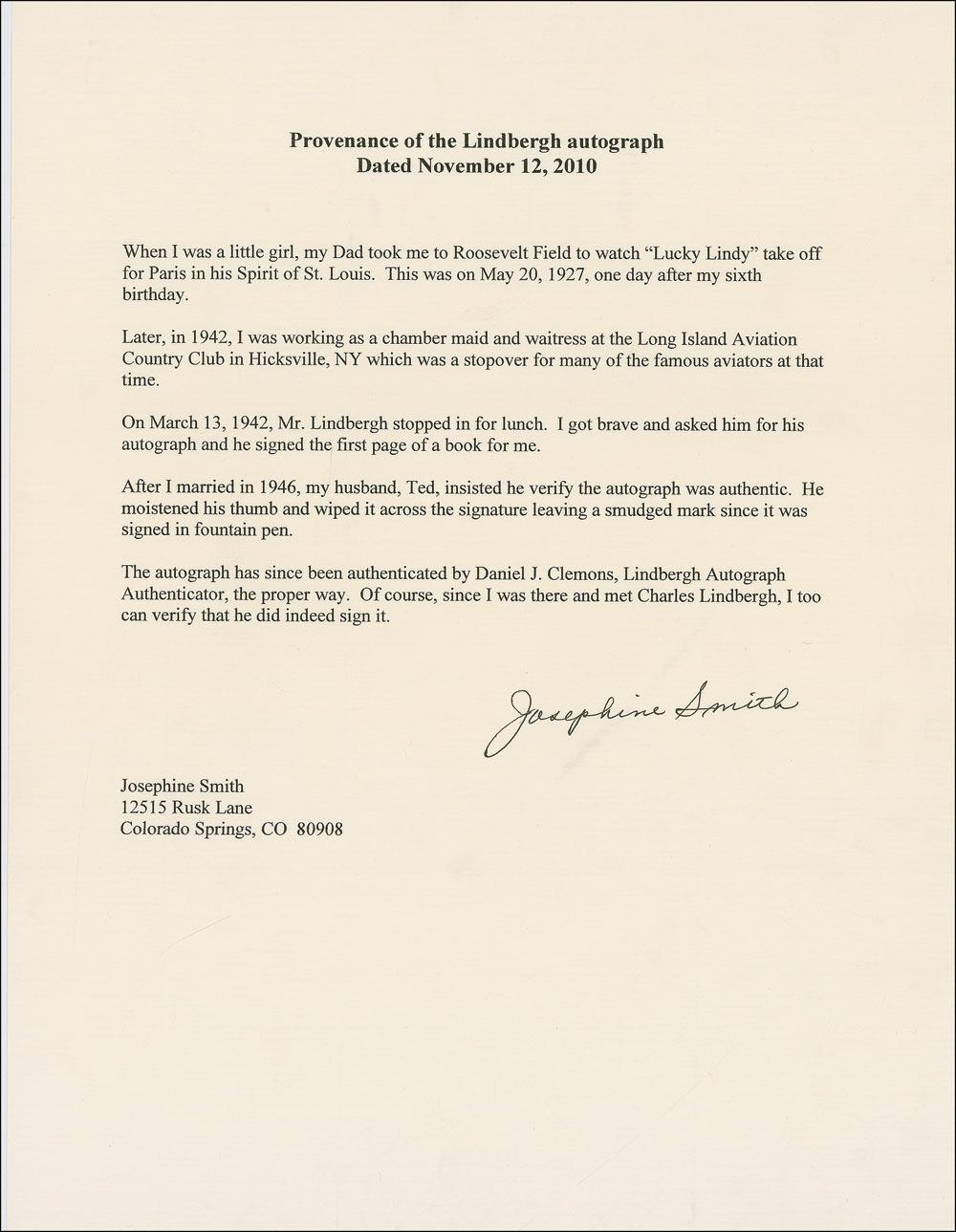 Fountain pen signature, “Charles A. Lindbergh. Mar 13, 1942, L.I.A.C.C.,” on an off-white 4.25 x 4 sheet. Smearing to the words (explained below), wrinkling to the paper, and trimmed edges, otherwise fine condition. According to the consignor, she witnessed Lucky Lindy take flight for Paris in 1927, and by 1942 was working as a chamber maid and waitress at the Long Island Aviation Country Club in Hicksville, New York, when she approached him for this autograph. Her husband, wanting to verify the signature’s authenticity, moistened his thumb and wiped it across the page leaving the smudge. Accompanied by a letter of authenticity from the original recipient and a CD of photos of the country club. Fantastic provenance!