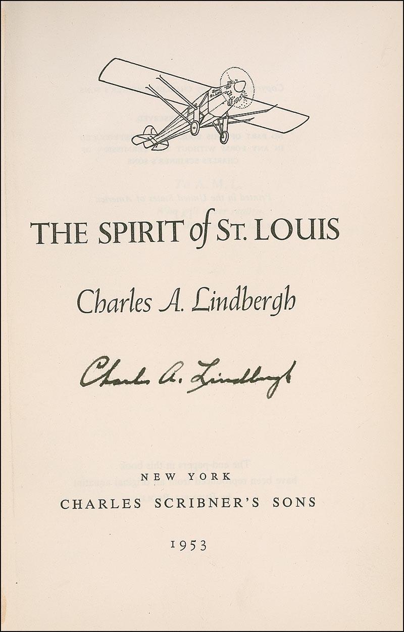 Signed book: The Spirit of St. Louis. First edition, first printing. NY: Charles Scribner's Sons, 1953. Hardcover with dustjacket, 5.75 x 8.5, 562 pages. Signed on the title page in black ink. In fine condition, with some trivial feathering to signature, and some scattered light wear and creasing to dustjacket. Accompanied by the book’s fabric bookmark made from the only Spirit replica ever flown by Lindbergh. Book is housed in a custom clamshell box. An exceptionally handsome copy!
