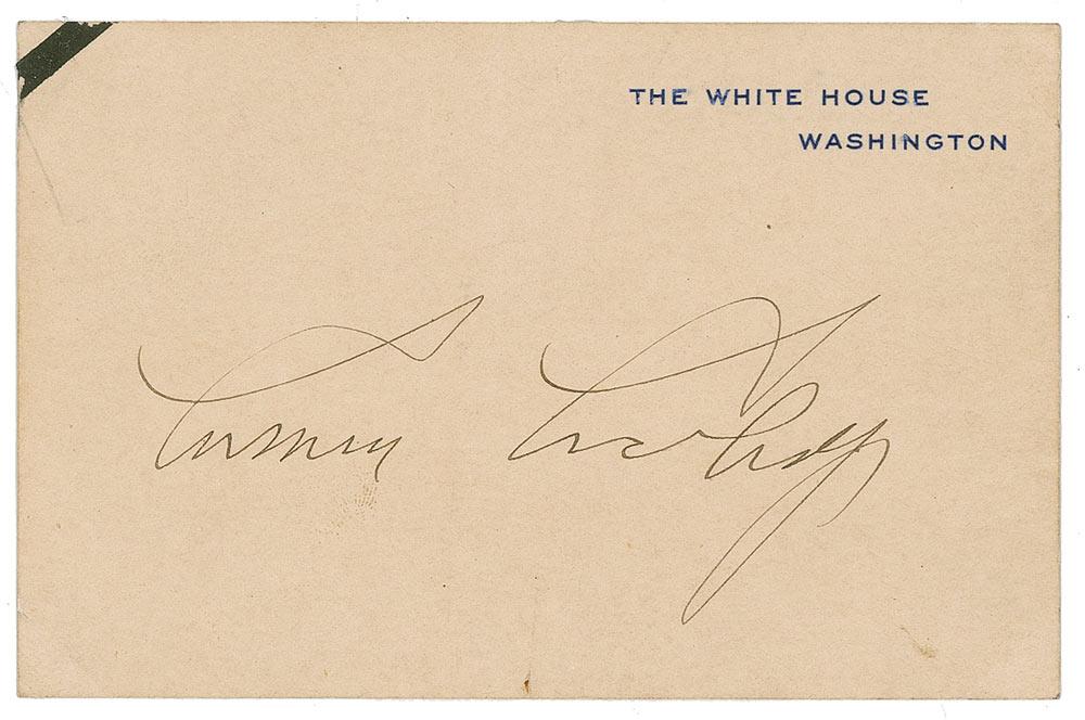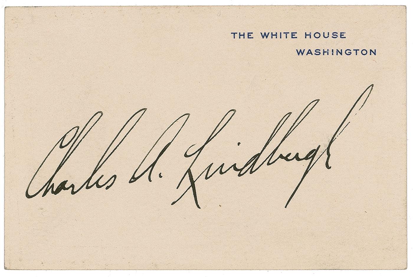 Very rare signed White House card, boldly signed in black ink, “Charles A. Lindbergh.” Pencil notation on reverse in another hand reads, “Monday took lunch with the President Oct. 17, 1927.” In fine condition, with a bit of scattered light toning and soiling, and a few trivial creases near top edge. Accompanied by a White House card signed in black ink by Calvin Coolidge. This card shows uniform toning, and a mounting remnant to top left corner. Consignor notes this Lindbergh’s card was taken and signed during a lunch meeting with Coolidge after Lindbergh’s historic 1927 flight.