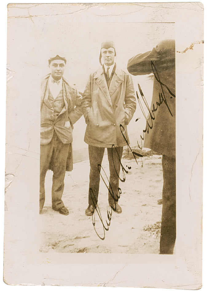 Unique vintage glossy 2.25 x 3 candid photo of Lindbergh standing with Edsel Ford, signed in fountain pen “Charles Lindbergh, Jr.” In very good condition, with scattered overall creasing and light surface scratches, and a small area of staining at the right border.