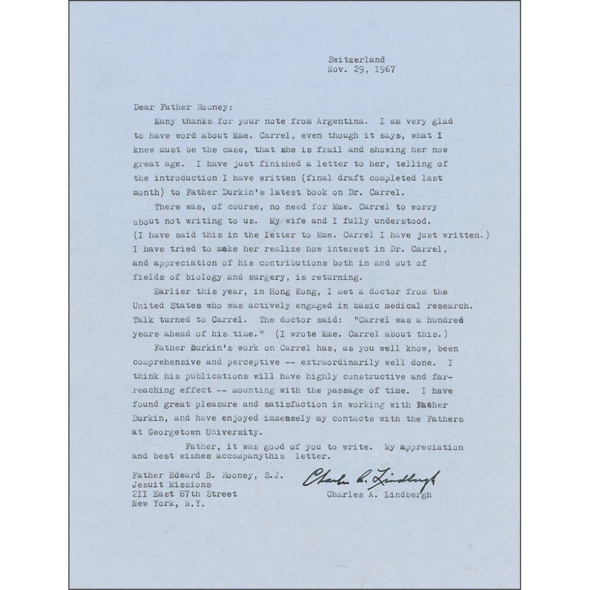 TLS signed “Charles A. Lindbergh,” one onionskin page, 8.5 x 11, November 29, 1967. Lindbergh contacts Jesuit priest Edward B. Rooney about pro-Nazi scientist Alexis Carrel. In part: “I am very glad to have word about Mme. Carrel, even though it says, what I knew must be the case, that she is frail and showing her now great age. I have just finished a letter to her, telling of the introduction I have written…to Father Durkin’s latest book on Dr. Carrel…Earlier this year, in Hong Kong, I met a doctor from the United States who was actively engaged in basic medical research. Talk turned to Carrel. The doctor said: ‘Carrel was a hundred years ahead of his time.’ (I wrote Mme. Carrel about this.) Father Durkin’s work on Carrel has, as you well know, been comprehensive and perceptive—extraordinarily well done. I think his publication will have highly constructive and far-reaching effect—mounting with the passage of time.” In fine condition, with bottom right corner crease, a central horizontal and vertical fold, and a staple hole at the upper left corner, none of which disrupt his bold signature. Carrel and Lindbergh co-authored a book and worked in the mid-1930s to create a pump that allowed living organs to exist outside of the body during surgery. The advance was a crucial step in the development of open-heart surgery and organ transplant. Carrel's fascist and Nazi sympathies, as well as his anti-Semitism, are believed to have had a great influence on Lindbergh.