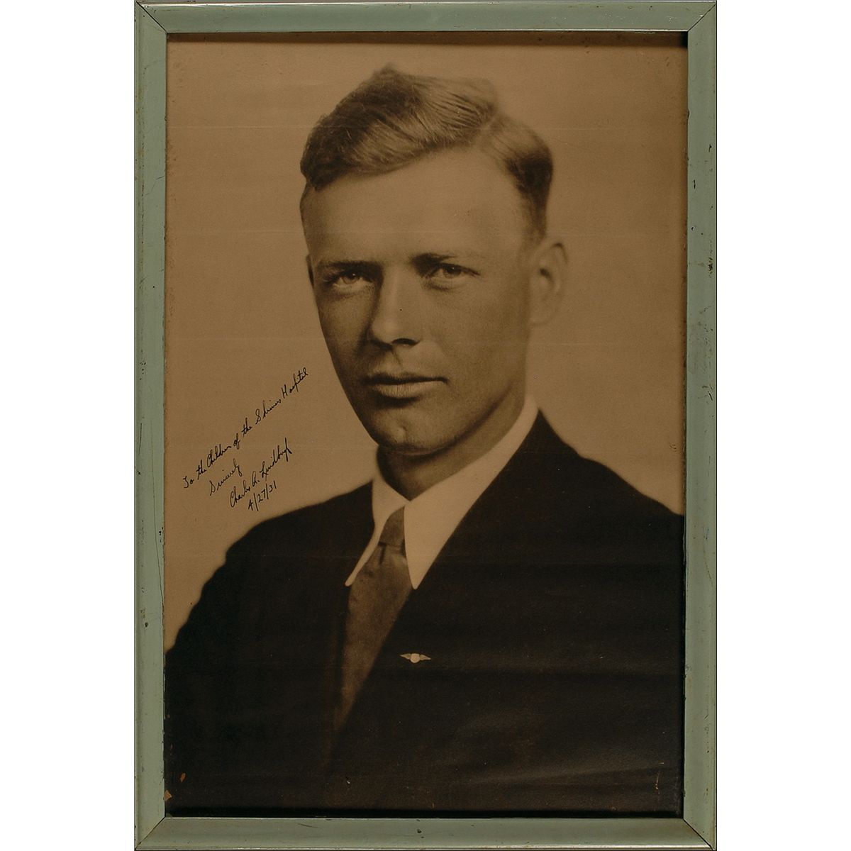Vintage sepia 11.5 x 17.5 paperstock photo, signed and inscribed in ink “To the Children of the Shriner Hospital, Sincerely, Charles A. Lindbergh, 4/27/31.” Framed to an overall size of 13 x 19. In very good to fine condition, with horizontal creases. Before coming to RR Auction, this photo resided at the Shriner’s Hospital for Crippled Children in Greenville, S. C. It was gifted to Arthur McAllister, who was a much beloved teacher’s aide at the hospital for over eight years. A beautiful and crisp image of the determined aviator.