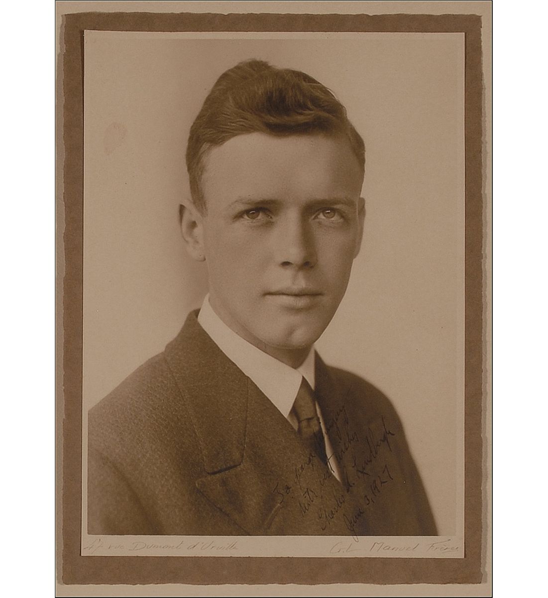 Vintage matte-finish 8 x 11 photo, signed and inscribed in fountain pen, “To George Wingay, With best wishes, Charles A. Lindbergh, June 3, 1927.” Photo is affixed to its original slightly larger mount and grandly suede matted and framed with a .5 x .5 swatch of fabric from the Spirit of St. Louis, four photos of Lindbergh, and two name plaques to an overall size of 39.25 x 35.5. In fine condition, with small stain to background, a bit of scattered light silvering, and photographer’s notations to lower border.