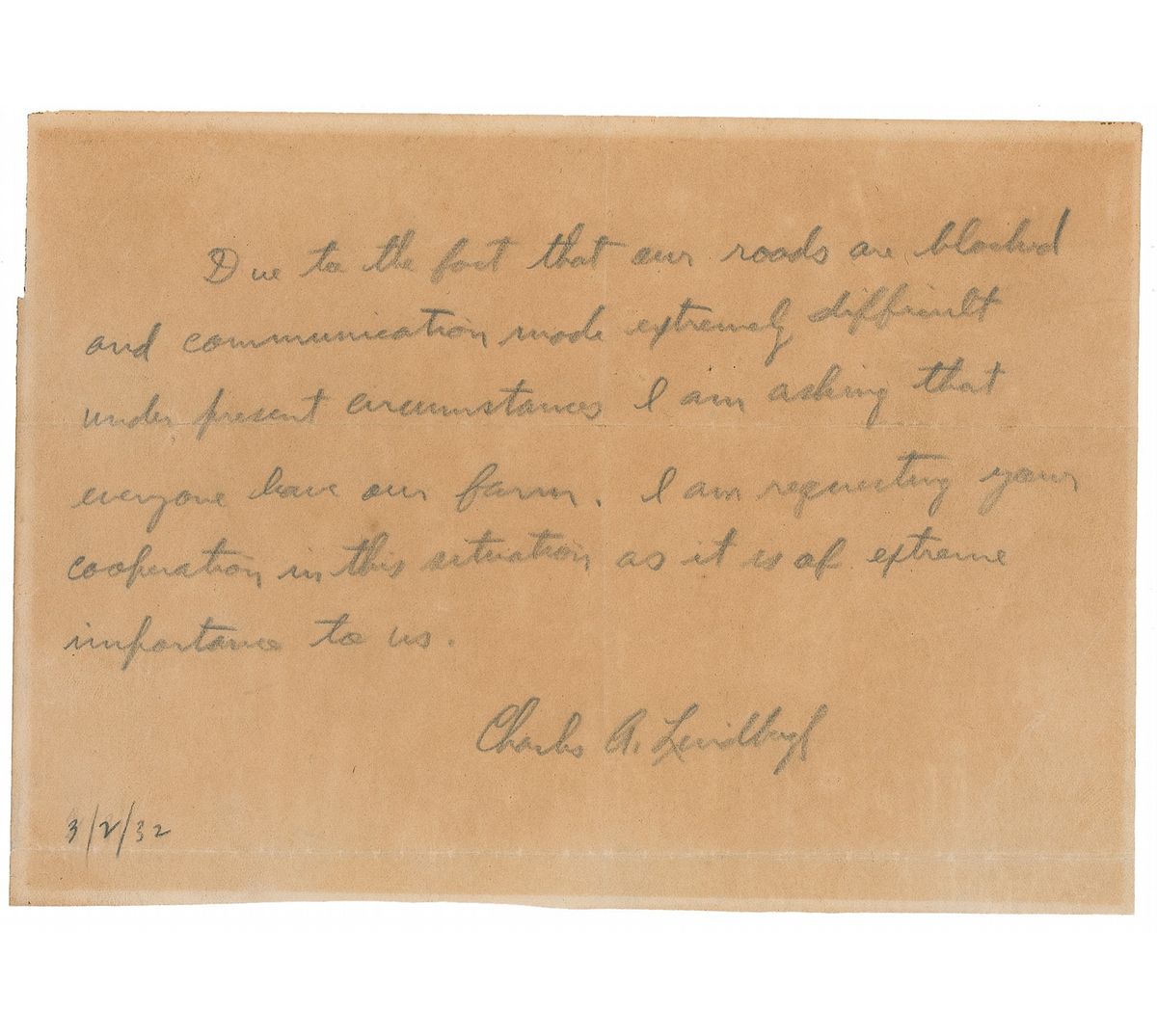 Remarkable and historically significant ALS written in pencil, signed “Charles A. Lindbergh,” one page, 8.25 x 6, dated at the bottom March 2, 1932. Lindbergh writes, in full: “Due to the fact that our roads are blocked and communication made extremely difficult under present circumstances I am asking that everyone leave our farm. I am requesting your cooperating in this situation, as it is of extreme importance to us.” Intersecting folds, one lightly grazing a single letter of the signature, and a moderate block of toning to sheet, otherwise fine condition. Accompanied by a copy of the original letter of provenance from Karl Bickel, signed “KAB,” which states, “Personally given to me early (8 a.m.appasx) on morning after kidnapping in order to get large body reporters off lawn so that possible conversation with kidnappers could be made. Request agreed too.”