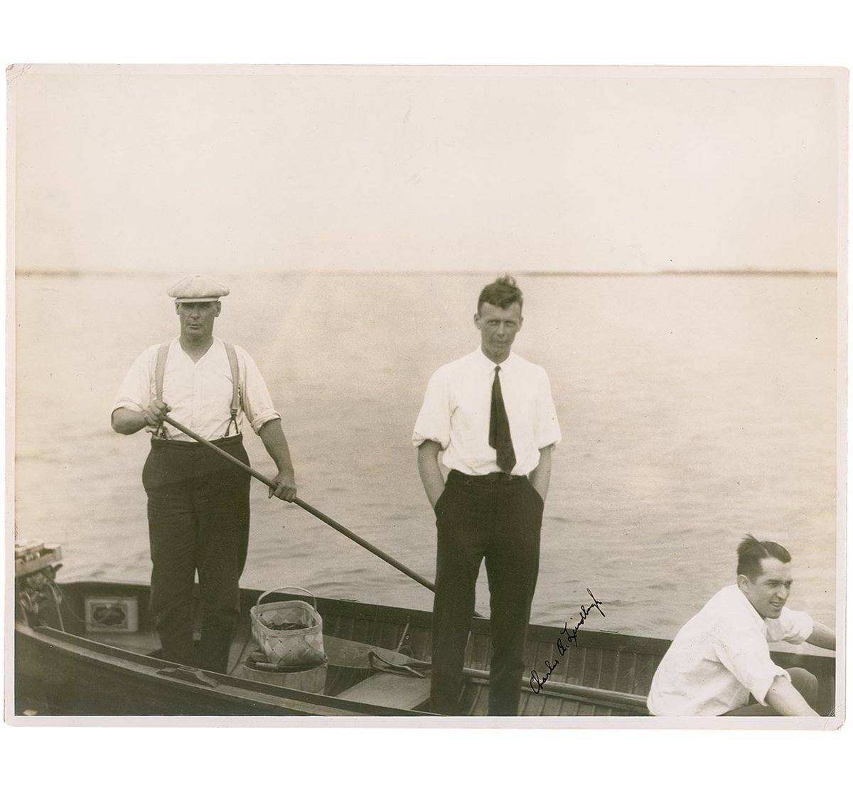 Vintage matte-finish 13.75 x 10.75 photo of a relaxed Lindbergh standing in a motorboat, his hands in his pockets, flanked by two other men, signed in fountain pen, “Charles A. Lindbergh.” In very good condition, with light creases to corner tips, some light silvering to darker areas of image and around signature, some slight discoloration to background, as well as some more noticeable spotting, visible mainly at an angle.