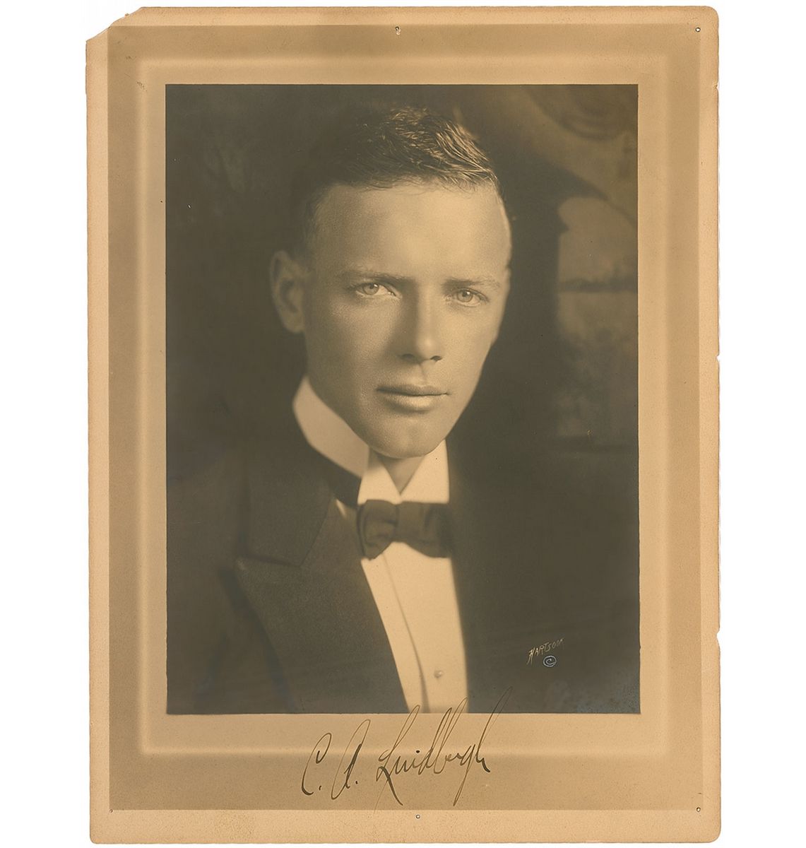 Vintage matte-finish 9 x 12 formal Hartsook portrait of Lindbergh in a tuxedo, signed in the lower border in fountain pen, “C. A. Lindbergh.” In very good to fine condition, with tack holes to borders and edges, which could be matted out, missing top left corner tip, and scattered silvering to darker areas of image and background. Accompanied by three vintage photos of a military pilot including two 10 x 8 photos taken at an airport, and one unsigned 7 x 9 portrait of the pilot. Boasting an exceptionally large and bold uninscribed signature.
