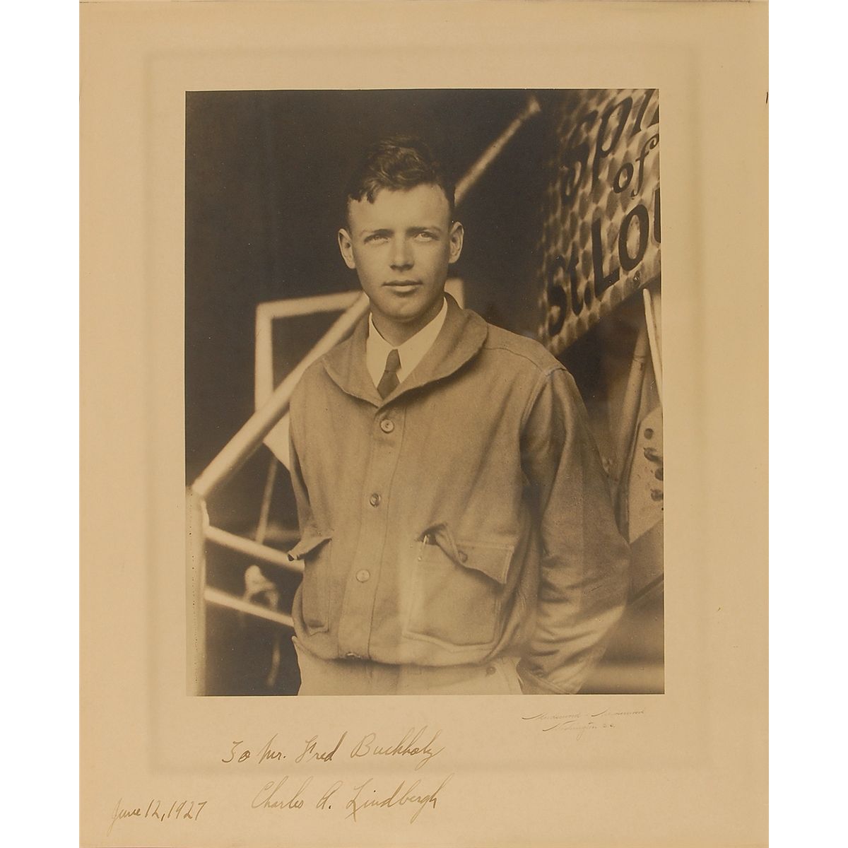 Exceptional oversized vintage matte-finish 10.5 x 12.75 Underwood and Underwood photo of Lindbergh posing with the Spirit of St. Louis, signed and inscribed in the lower border in fountain pen “To Mr. Fred Buchholz, Charles A. Lindbergh, June 12, 1927.” Matted and framed to an overall size of 16 x 18.5. In fine condition. A superb example of Lindbergh posing with his historic aircraft, signed very soon after his iconic flight.