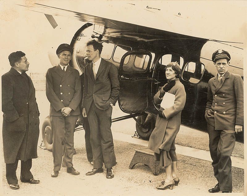Vintage glossy 10 x 8 photo of the Lindberghs in front of their Lockheed Vega monoplane with a few Central Airport managers. Scattered surface impressions, some soiling to the upper left, and spotted silvering to dark areas of the image, otherwise fine condition. Accompanied by sections of two newspapers that published the photo, dated April 19 and 20, 1933.