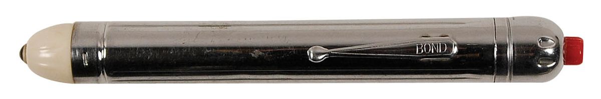 Pocket flashlight, with a 5.5? aluminum tube, battery operated, with red on/off button and pocket clip, marked “Bond,” on the clip. In fine condition, with expected light wear. Accompanied by a copy of a letter of authentication by noted Charles Lindbergh expert Ev Cassagneres explaining the story behind the survival equipment purchased by Lindbergh which was carried on board a Miles Mohawk airplane on flights through Europe and Asia. This item was purchased from a family friend of Anne Morrow Lindbergh.