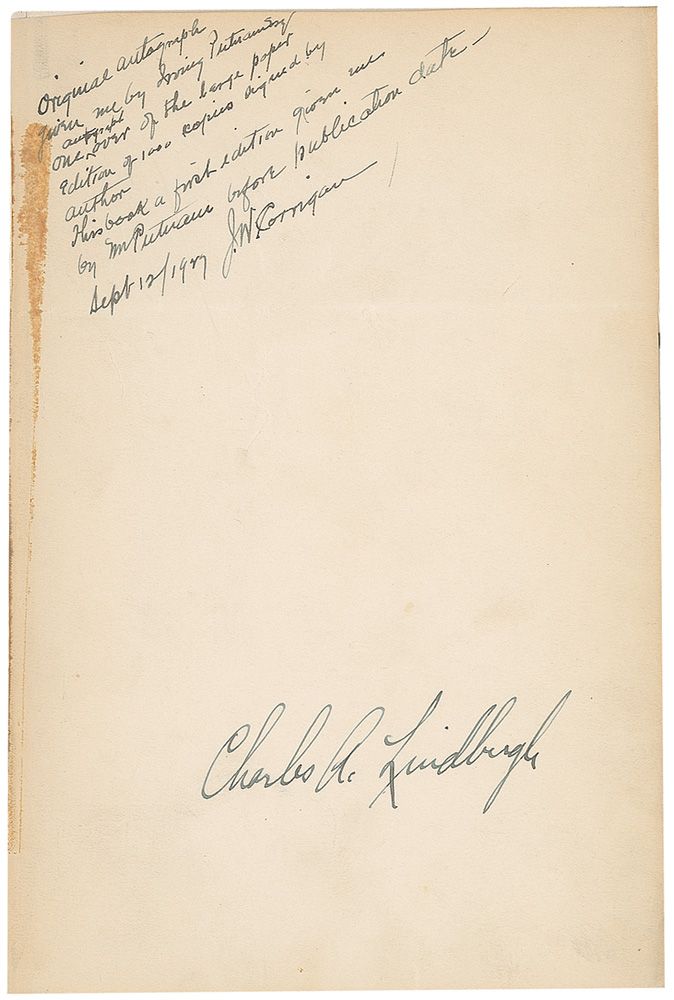 Signed book: We. First edition. NY: G.P. Putnam’s Sons, 1927. Hardcover, 5.5 x 8.25, 318 pages. Signed on the second free end page in black ink, “Charles A. Lindbergh.” Page also bears an ink notation of provenance which reads “Original autograph given me by Irving Putnam…one autograph over [sic] of the large paper edition of 1000 copies signed by author. This book is a first edition given me by Mr. Putnam before publication date. Sept 12/1927, J. W. Corrigan.” Autographic condition: A couple light creases, adhesive residue to left edge and a bit of scattered light soiling, otherwise fine condition. Book condition: G/None. Blue cloth-covered boards with gilt titles; edges worn, with small tears in cloth at corners and spine-ends; slightly yellowed and soiled; front hinge cracked, with first four pages detached; discoloration along hinge where pages were likely taped in; first few gatherings loose; small piece of non-archival tape to front pastedown (where an ad for the book was taped in; ad now laid in); rear hinge starting.