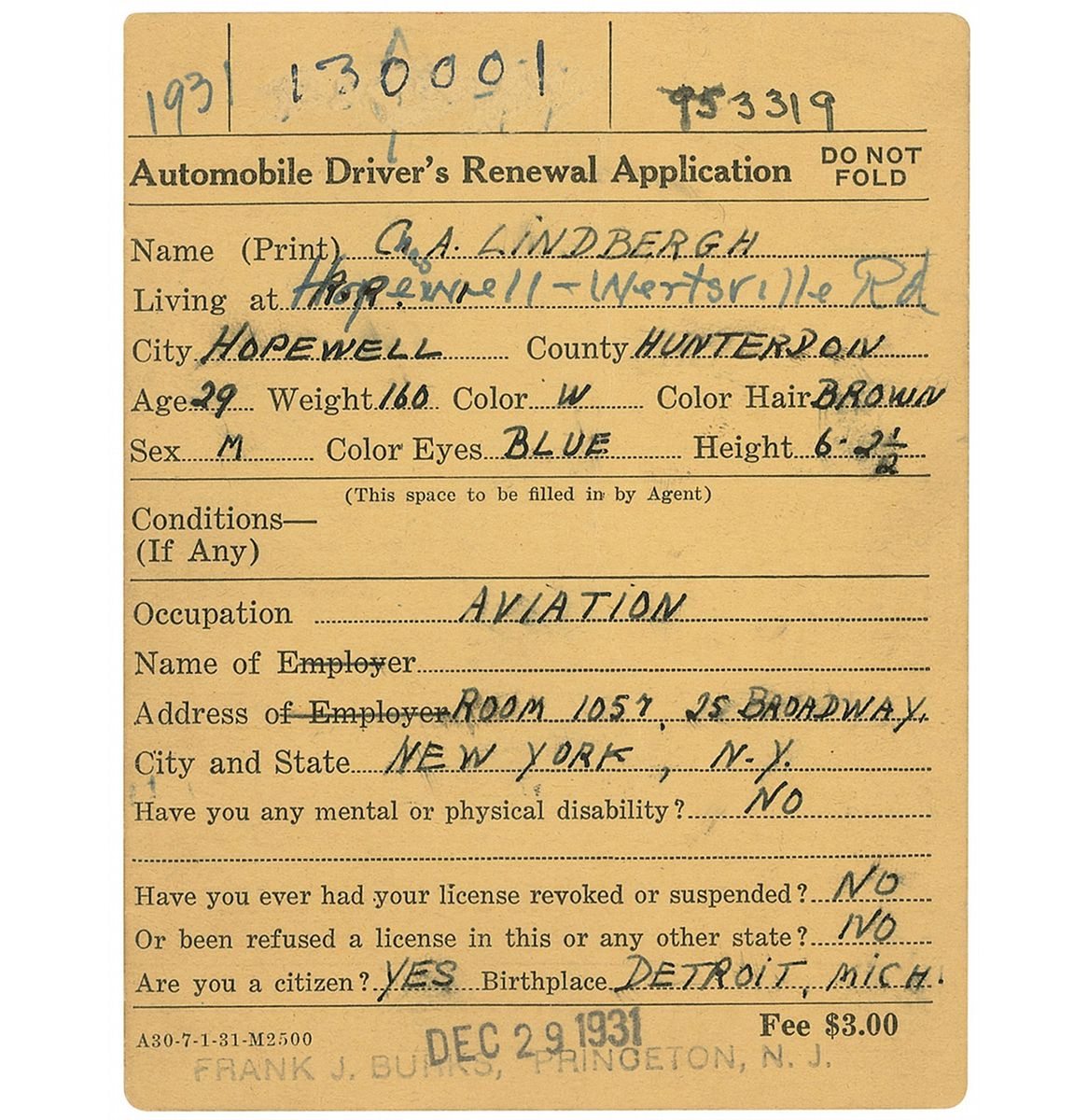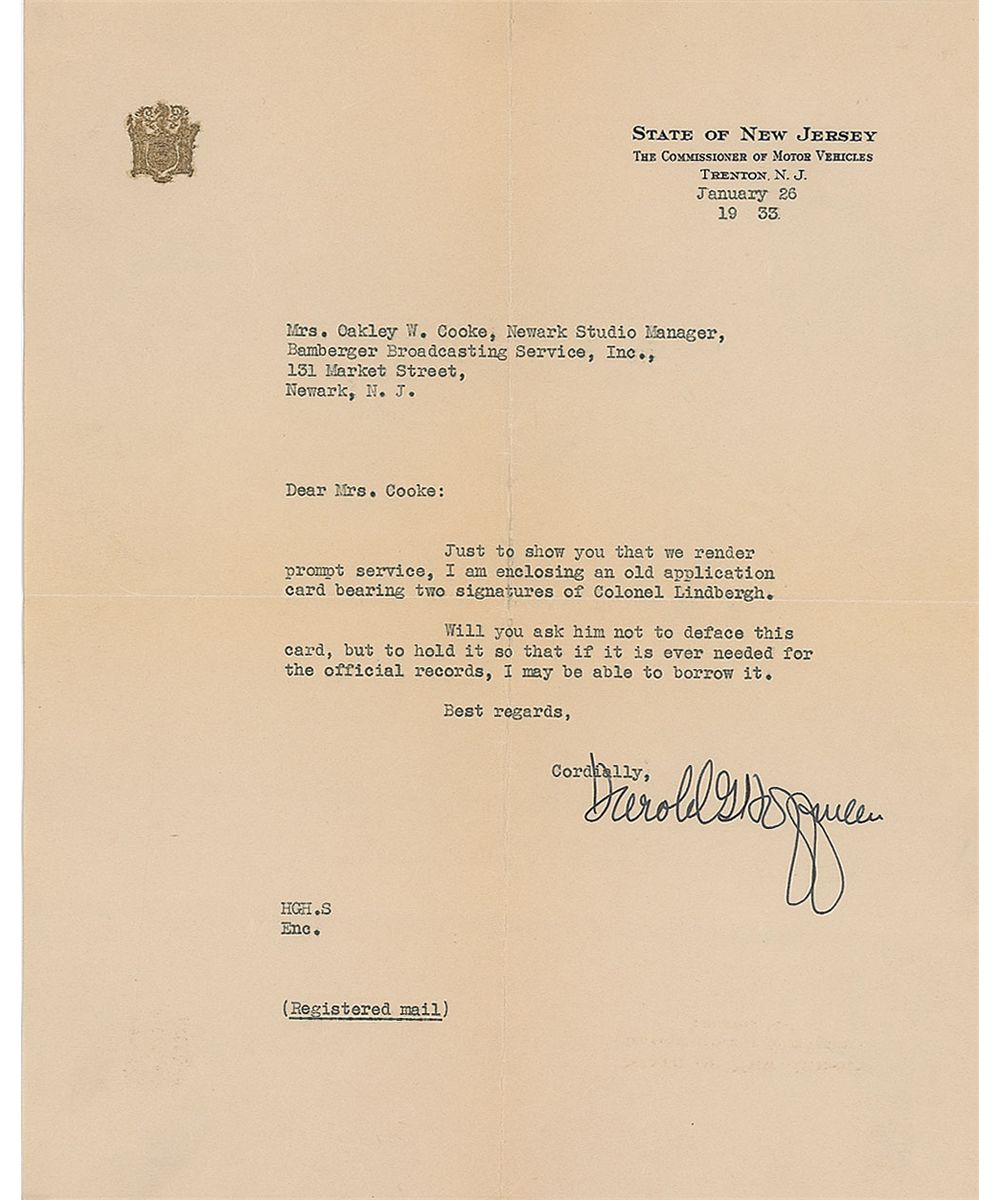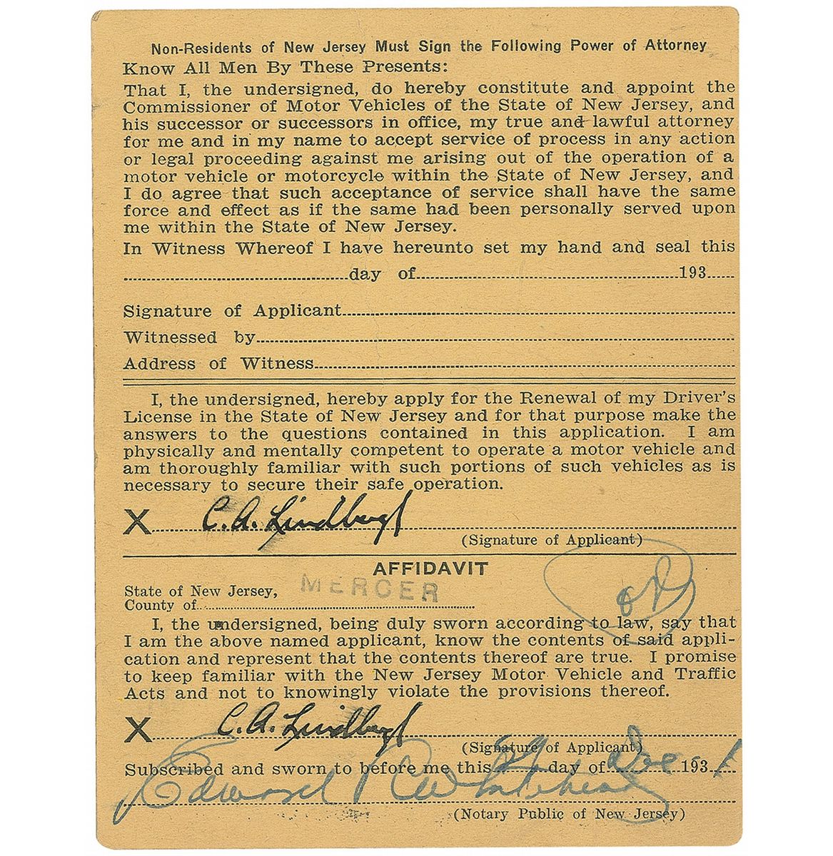 DS, signed “C. A. Lindbergh,” one page both sides, 3.75 x 5, December 29, 1931. Lindbergh’s state of New Jersey driver’s license renewal application, filled and signed twice on the reverse by Lindbergh. Lindbergh has added his personal and physical information in black ink, listing his occupation as “Aviation,” and identifies himself as self-employed as both lines mentioning “Employer” having been crossed out. Signed twice on the reverse by Lindbergh attesting that all the information provided is true. A light central vertical crease passing through a single letter of each signature, a couple trivial brushes to signatures, as well as written information, and mild handling wear, otherwise fine condition. Accompanied by a January 26, 1933 TLS to Mrs. Oakley Cooke, the Newark Studio Manager of Bamberger Broadcasting Service, which accompanied the application in the mail. Letter reads, in part: “Just to show you that we render prompt service, I am enclosing an old application card bearing two signatures of Colonel Lindbergh. Will you ask him not to deface this card, but to hold it so that if it is ever needed for the official records, I may be able to borrow it.” Also accompanied by the original mailing envelope for the letter. Just three months after renewing his license, Lindbergh’s life would be turned upside down when his 20-month old son was kidnapped from their home in New Jersey.