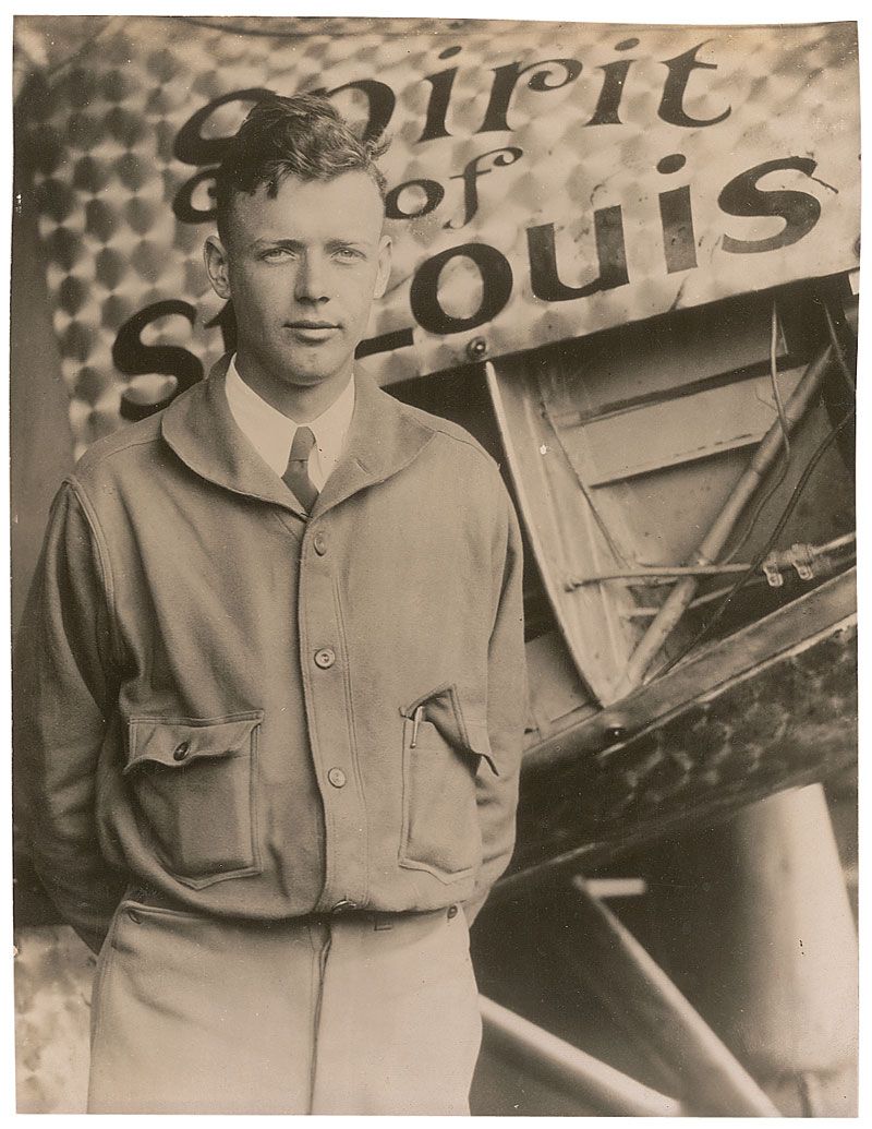 Original 7 x 9 photo of Lindbergh posing in front of the Spirit of St. Louis. In fine condition, with a few scattered creases.