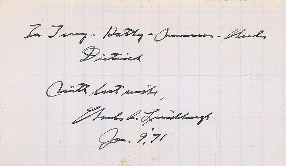 Fountain pen signature and inscription, “To Terry, Kathy, Warren [?], Charles Dietrich, With best wishes, Charles A. Lindbergh, Jan. 9, ’71,” on an off-white 7 x 4 lightly lined sheet. Intersecting folds passing through the inscription and signature, otherwise fine condition.
