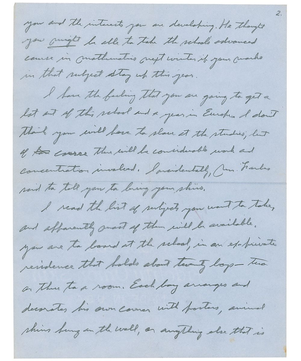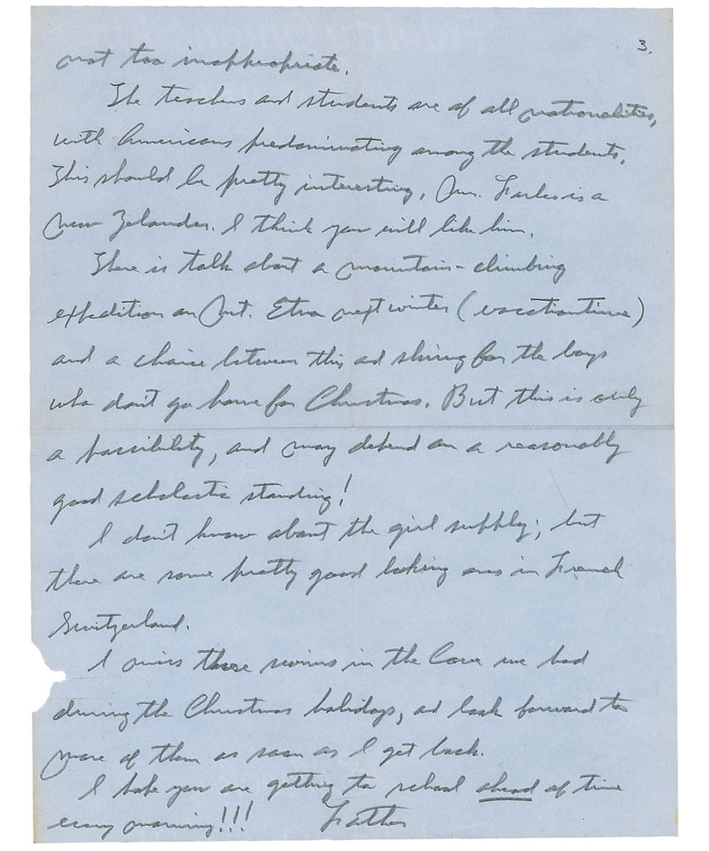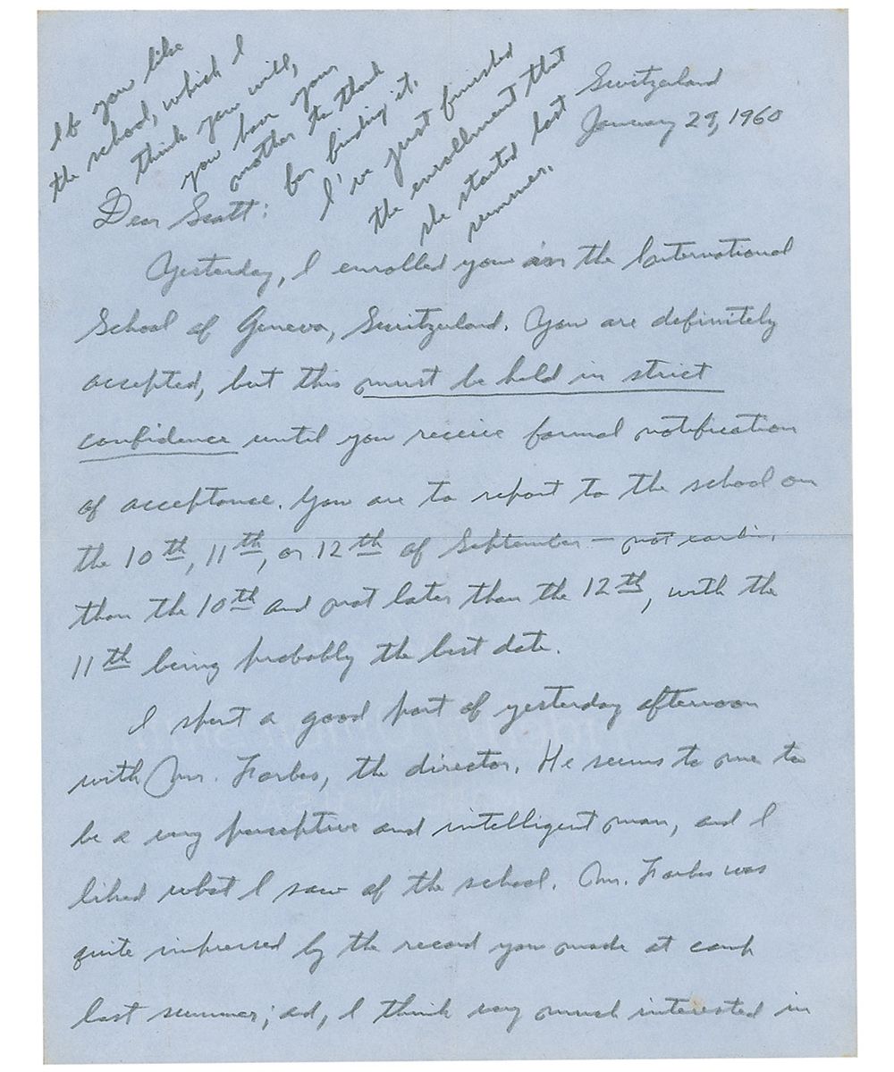 ALS, in pencil, signed “Father,” three onionskin pages, 8.25 x 10.75, January 29, 1960. From Switzerland, Lindbergh writes to his son Scott. In part: “Yesterday, I enrolled you in the International School of Geneva, Switzerland. You are definitely accepted, but this must be held in strict confidence until you receive formal notification of acceptance. You are to report to the school on the 10th, 11th, or 12th of September-not earlier than the 10th and not later than the 12th, with the 11th being probably the best date…Mr. Forbes was quite impressed by the record you made at camp last summer, and, I think very much interested in you and the interests you are developing. He though you might be able to take the school's advanced course in mathematics next winter if your marks in that subject stay up this year. I have the feeling that you are going to get a lot out of this school and a year in Europe. I don't think you will have to slave at the studies, but of course there will be considerable work and concentration involved & incidentally, Mr. Forbes said to tell you to bring your skiis…I read the list of subjects you want to take and apparently most of them will be available. You are to board at the school, in an ex-private residence that holds about twenty boys -two or three to a room. Each boy arranges and decorates his own corner with posters, animal skins hung on the wall, or anything else that is not too inappropriate…There is talk about a mountain-climbing expedition on Mt. Etna next winter (vacation time) and a choice between this and skiing for boys who don't go home for Christmas. But this is only a possibility, and may depend on a reasonably good scholastic standing! I don't know about the girl supply; but there are some pretty good looking ones in French Switzerland.” In fine condition, with central horizontal and vertical fold to each page and a paperclip impression to top edges.