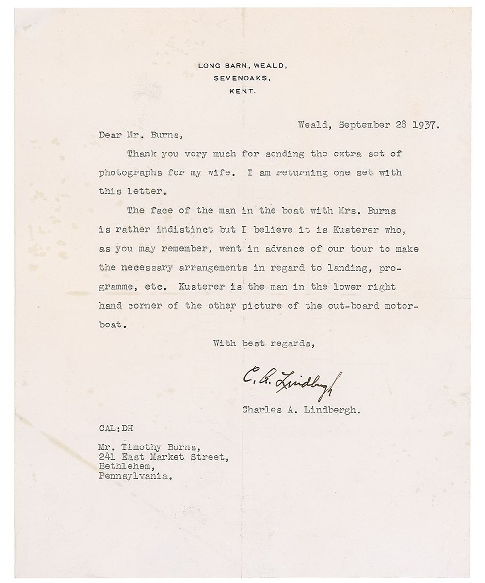 TLS signed “C. A. Lindbergh,” one page, 8 x 10, Long Barn, Weald letterhead, September 28, 1937. Letter to Timothy Burns. In full: “Thank you very much for sending the extra set of photographs for my wife. I am returning one set with this letter. The face of the man in the boat with Mrs. Burns is rather indistinct but I believe it is Kusterer who, as you may remember, went in advance of our tour to make the necessary arrangements in regard to landing, programme, etc. Kusterer is the man in the lower right hand corner of the other picture of the out-board motorboat.” In very good condition, with central horizontal and vertical fold, a few other creases and wrinkles, and scattered spotting, mostly to the blank areas. Milburn Kusterer, representing the Daniel Guggenheim Foundation for the Promotion of Aeronautics, had handled all the details of Lindbergh’s three month tour of the United States after his epic transatlantic flight to Paris. Accompanying this letter are 11 x 8.5 reproductions of three of the 13.75 x 10.75 photographs of Lindbergh returned by the aviator to Burns with this letter.