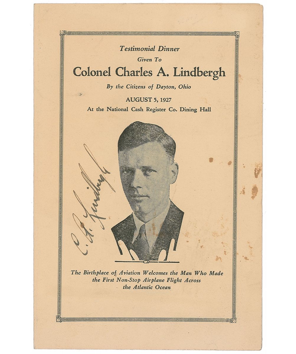 Program for a testimonial dinner honoring Lindbergh hosted by the citizens of Dayton, Ohio, on August 5, 1927, 5.5 x 8.25, two pages, signed on the front beside his image, “C. A. Lindbergh.” Some scattered staining to the front mostly confined to the right side, with one spot trivially affecting the “A” in the signature, otherwise fine condition. An especially interesting association, as Dayton was the hometown of the Wright Brothers.