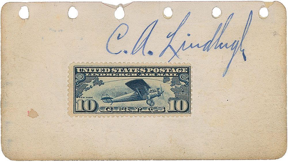 Vintage fountain pen signature, “C. A. Lindbergh,” on an off-white 4.5 x 2.5 page. A 10-cent US ‘Lindbergh Airmail’ postage stamp featuring an airplane is affixed below. In very good to fine condition, with scattered toning and soiling, a ding to the top edge, and slight show-through to top edge from reinforced binding holes.