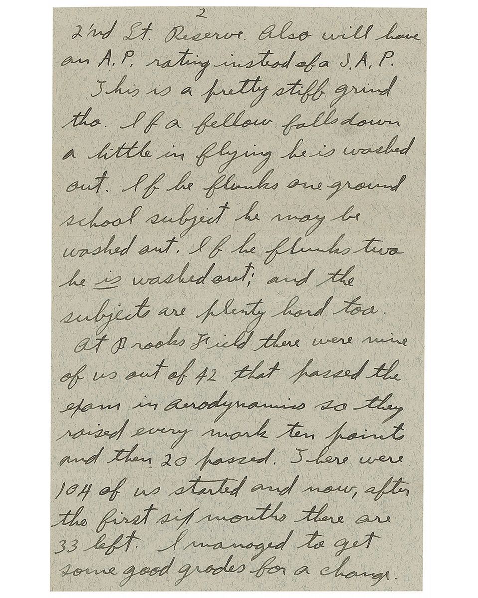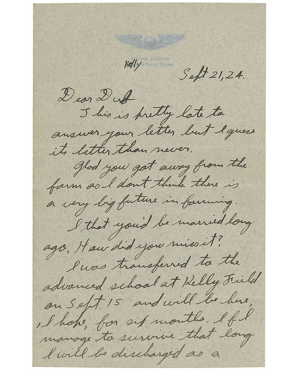 When 22-year-old Charles Lindbergh enlisted in the US Army to become an Air Service Reserve pilot, he was one of 104 cadets who began the rigorous training program at Brooks Field in San Antonio. Quickly whittled down to only 33, the remaining cadets were transferred to Kelly Field to complete the advanced training and extraordinarily difficult course work—“There were 24 subjects at Brooks Field and there will be more here.” Noting how easy it is to be “washed out,” and how surprising it is that no one in his current class has been killed in training with the D.H.4 planes, which “usually get whoever is in them,” he proudly (but reservedly) remarks, “If we get thru six more months without bumping anyone off, I believe we will be the first class to do it.” By the end of the six months, only 19 cadets achieved success, earning the rank of second lieutenants in the Reserve Officer Corps: Lindbergh stood first in his class. With such a detailed first-hand account of his intense training in San Antonio, this is an extraordinary letter from the young cadet who would go on to become an aviation legend: the earliest Lindbergh we have ever offered!