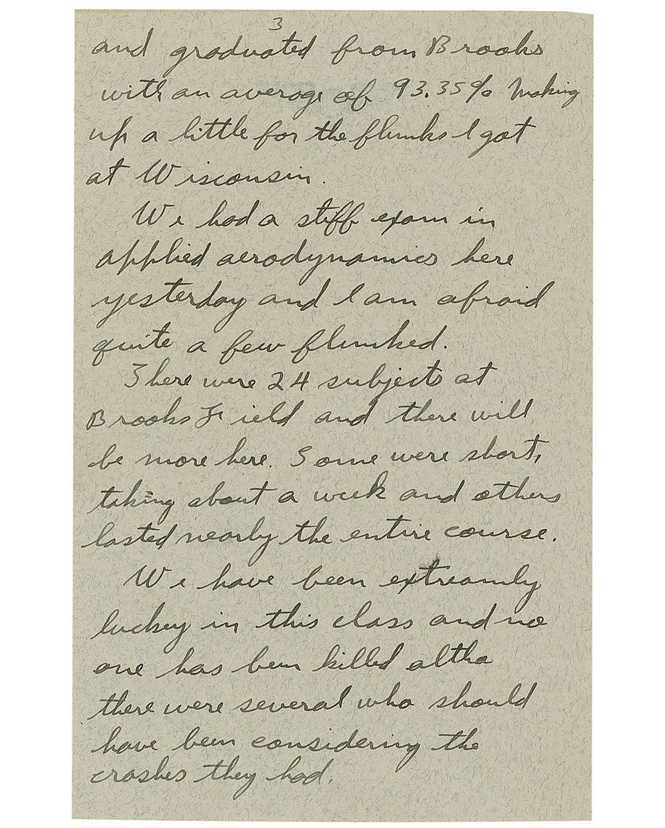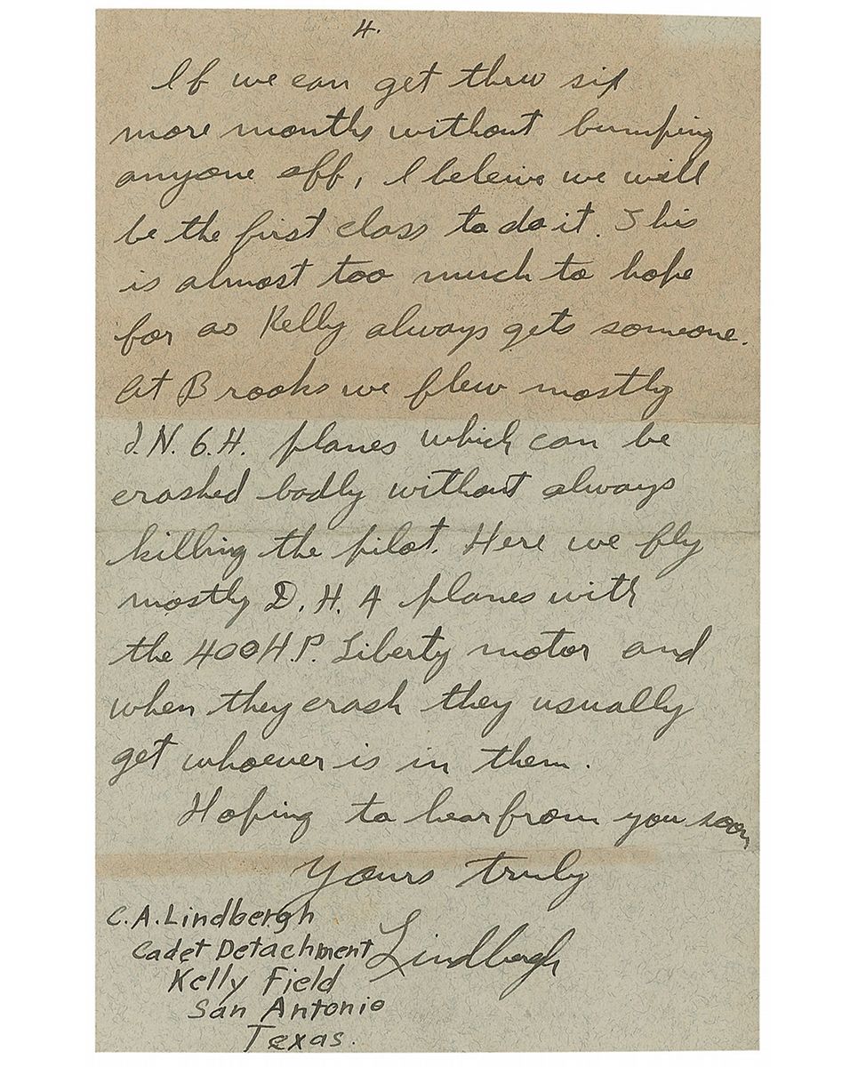 ALS signed “Lindbergh,” four pages on two adjoining sheets, 5 x 8, Flying Cadets letterhead, September 21, 1924. Letter to his friend “Dub.” In part: “Glad you got away from the farm as I don’t think there is a very big future in farming. I thot [sic] you’d be married long ago. How did you miss it? I was transferred to the advanced school at Kelly Field on Sept. 15 and will be here, I hope, for six months. If I manage to survive that long I will be discharged as a 2nd Lt. Reserve. Also will have an A.P. rating instead of a J.A.P. This is a pretty stiff grind tho [sic]. If a fellow falls down a little in flying he is washed out. If he flunks one ground school subject he may be washed out. If he flunks two he is washed out; and the subjects are plenty hard too. At Brooks Field there were nine of us out of 42 that passed the exam in aerodynamics so they raised every mark ten points and then 20 passed. There were 104 of us started and now, after the first six months there are 33 left. I managed to get some good grades for a change and graduated from Brooks with an average of 93.35% making up a little for the flunks I got at Wisconsin. We had a stiff exam in applied aerodynamics here yesterday and I am afraid quite a few flunked. There were 24 subjects at Brooks Field and there will be more here. Some were short, taking about a week and others lasted nearly the entire course. We have been extreamly luckey [sic] in this class and no one has been killed altho [sic] there were several who should have been considering the crashes they had. If we get thru six more months without bumping anyone off, I beleive [sic] we will be the first class to do it. This is almost too much to hope for as Kelly always gets someone. At Brooks we flew mostly I.N.6.H. planes which can be crashed badly without always killing the pilot. Here we fly mostly D.H.4 planes with the HOOH.P. Liberty motor and when they crash they usually get whoever is in them.” In fine condition. Accompanied by a few related newspaper clippings.
