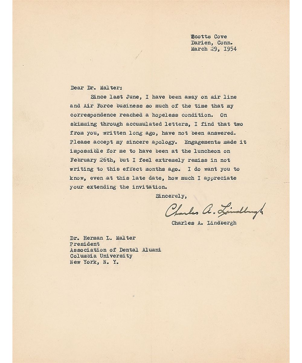 TLS signed “Charles A. Lindbergh,” one page, 8.5 x 11, March 29, 1954. Letter apologizing for late correspondence. In part: “Since last June, I have been away on air line and Air Force business so much of the time that my correspondence reached a hopeless condition…I find that two from you, written long ago, have not been answered. Please accept my sincere apology. Engagements made it impossible for me to have been at the luncheon on February 26th, but I feel extremely remiss in not writing to this effect months ago.” In fine condition, with central horizontal and vertical folds. Accompanied by the original mailing envelope.