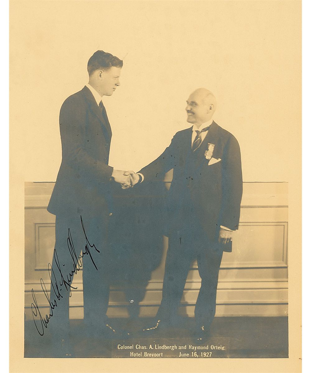 Superb vintage matte-finish 7.75 x 9.75 photo of Lindbergh with Raymond Orteig after his successful transcontinental flight, neatly signed in fountain pen, “Charles A. Lindbergh.” In fine condition, with moderate silvering to dark areas of the image and trivial soiling to lower right edge. New York hotel owner Raymond Orteig offered a prize of $25,000 to the first aviator to fly nonstop from New York to Paris. By 1927 it had still not been claimed, and Lindbergh successfully completed the transcontinental flight in the Spirit of St. Louis. As shown in his photo, Lindbergh met Orteig at the Brevoort Hotel on June 16, 1927, to receive the prize. An exquisite image from a historic moment in aviation history.