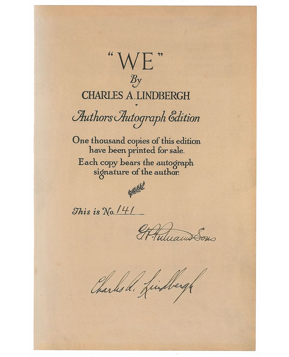 Colophon from the 1927 G. P. Putnam’s Sons limited first edition of We, numbered 141/1000, 5 x 8.75, signed in black ink, “Charles A. Lindbergh.” In fine condition.