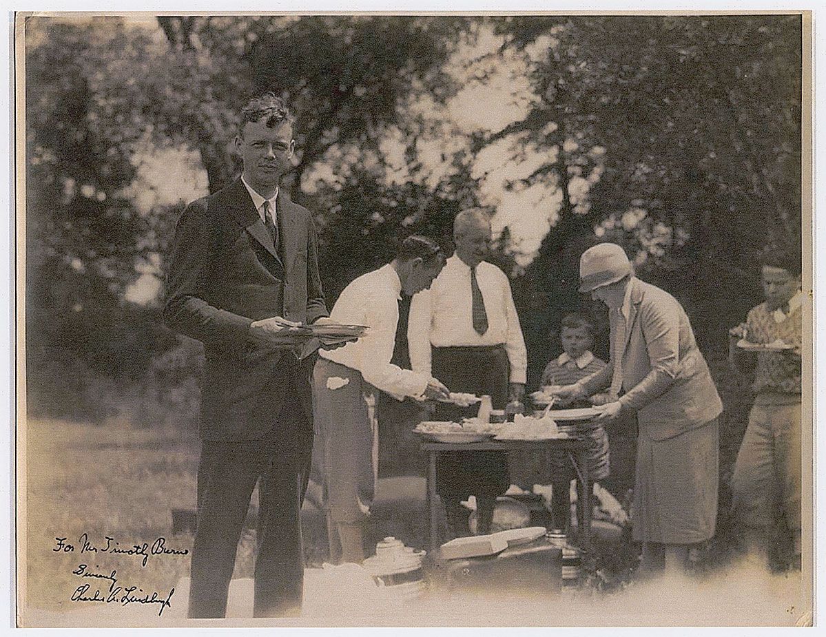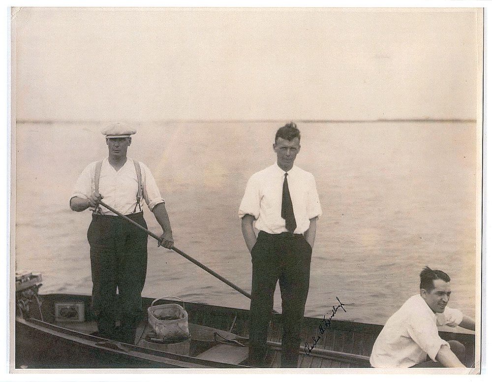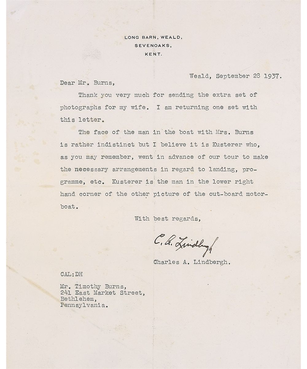 TLS signed “C. A. Lindbergh,” one page, 8 x 10, Long Barn, Weald letterhead, September 28, 1937. Letter to Timothy Burns. In full: “Thank you very much for sending the extra set of photographs for my wife. I am returning one set with this letter. The face of the man in the boat with Mrs. Burns is rather indistinct but I believe it is Kusterer who, as you may remember, went in advance of our tour to make the necessary arrangements in regard to landing, programme, etc. Kusterer is the man in the lower right hand corner of the other picture of the out-board motorboat.” In very good condition, with central horizontal and vertical fold, a few other creases and wrinkles, and scattered spotting, mostly to the blank areas. Milburn Kusterer, representing the Daniel Guggenheim Foundation for the Promotion of Aeronautics, had handled all the details of Lindbergh’s three month tour of the United States after his epic transatlantic flight to Paris. Accompanying this letter are 11 x 8.5 reproductions of three of the 13.75 x 10.75 photographs of Lindbergh returned by the aviator to Burns with this letter.