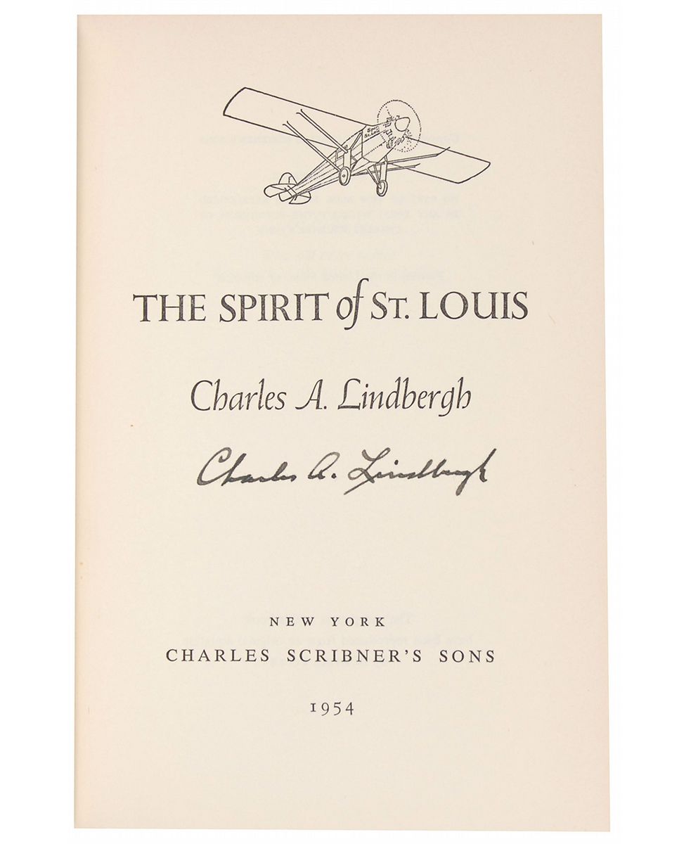 Signed book: The Spirit of St. Louis. Later printing. NY: Charles Scribner's Sons, 1954. Hardcover with dust jacket, 5.75 x 8.5, 562 pages. Boldly signed on the title page in black ink, “Charles A. Lindbergh.” Autographic condition: fine. Book condition: VG/VG- (with one split interior hinge). Accompanied by a letter from the original recipient, dated December 1954, transmitting the book as a Christmas gift he obtained from Lindbergh’s uncle.
