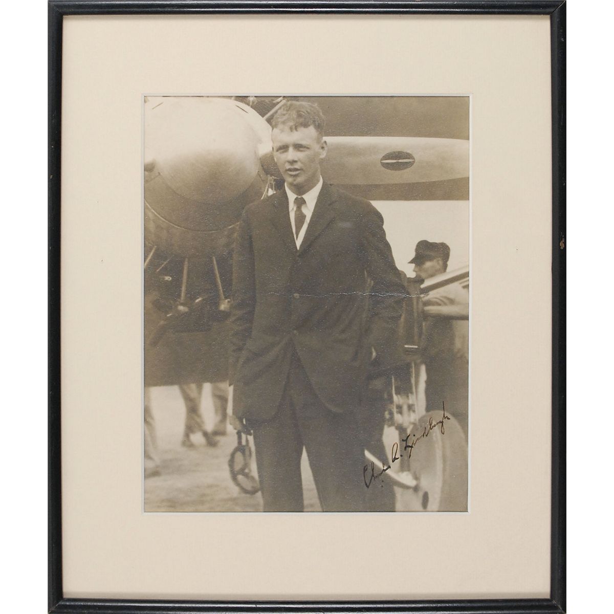 Vintage matte-finish 7 x 9.25 photo of Lindbergh, dressed in a suit and tie, his goggles in his hand, standing in front of the Spirit of St. Louis, signed in fountain pen, “Charles A. Lindbergh.” Matted and framed to an overall size of 11 x 13.5. Included with the photo is a portion of the original backing, with “Given to H. L. Slater by Charles A. Lindbergh, N.Y.C.,” in an unknown hand. In fine condition, with a light central horizontal crease, and some scattered light silvering. An impressive, uninscribed portrait taken very shortly before his historic flight.
