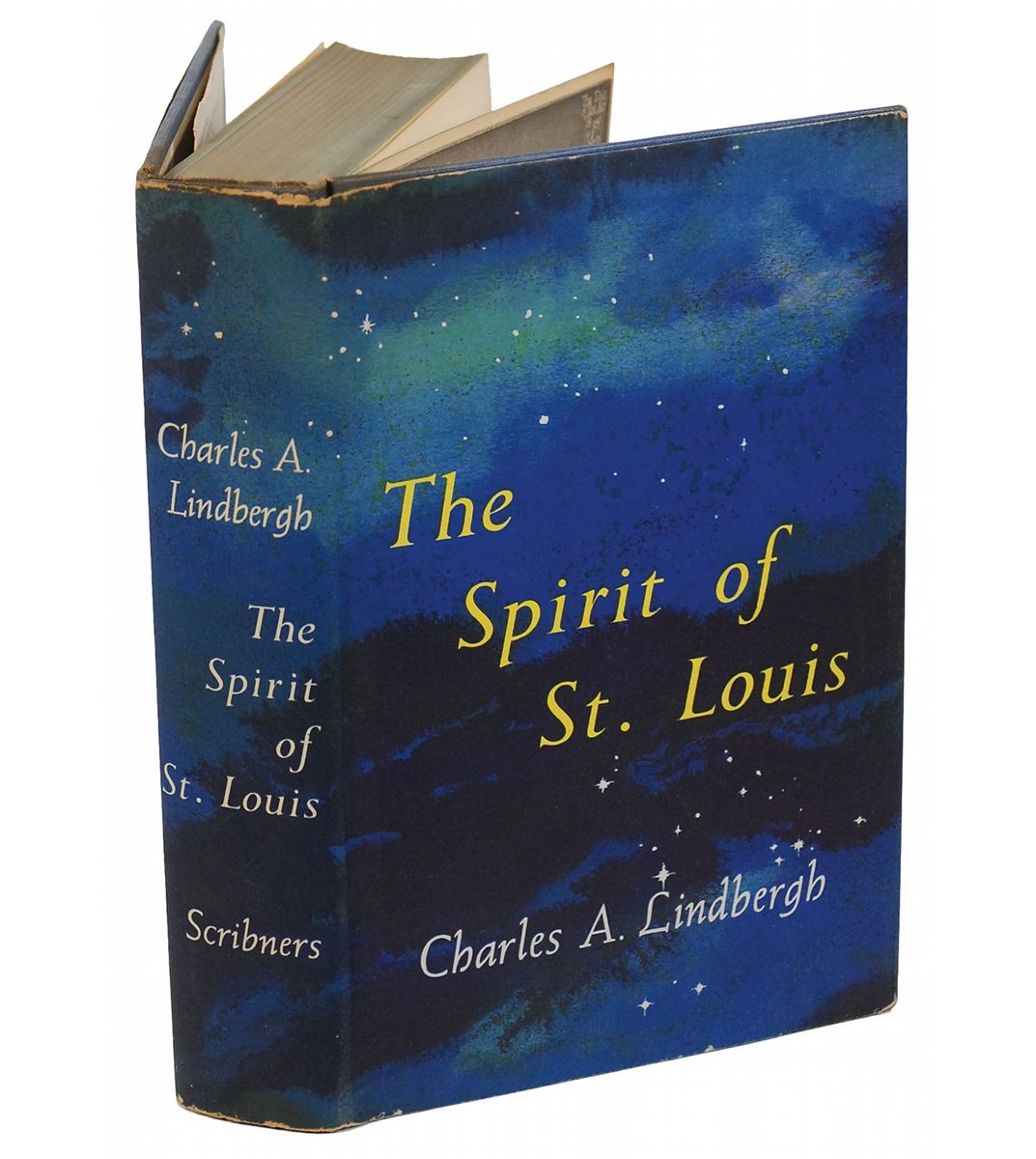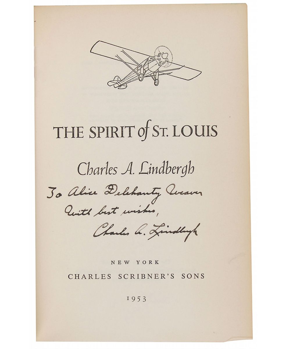 Signed book: The Spirit of St. Louis. Trade edition. NY: Charles Scribner's Sons, 1953. Hardcover with dust jacket, 5.75 x 8.5, 562 pages. Signed and inscribed on the title page, “To Alice Delehanty Weaver, With best wishes, Charles A. Lindbergh.” Autographic condition: fine, with a trivial spot of paper loss to lower right corner tip and some mild edge toning to signed page. Book condition: VG/VG-. Accompanied by a full letter of authenticity from PSA/DNA, as well as a copy of an email from Daniel J. Clemons, Manuscript Archivist for the Charles A. Lindbergh family, authenticating the signature.