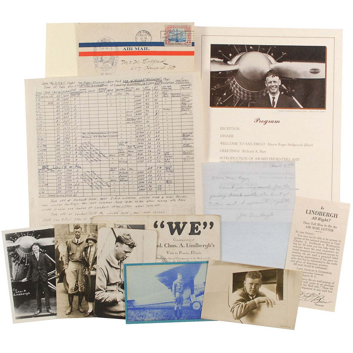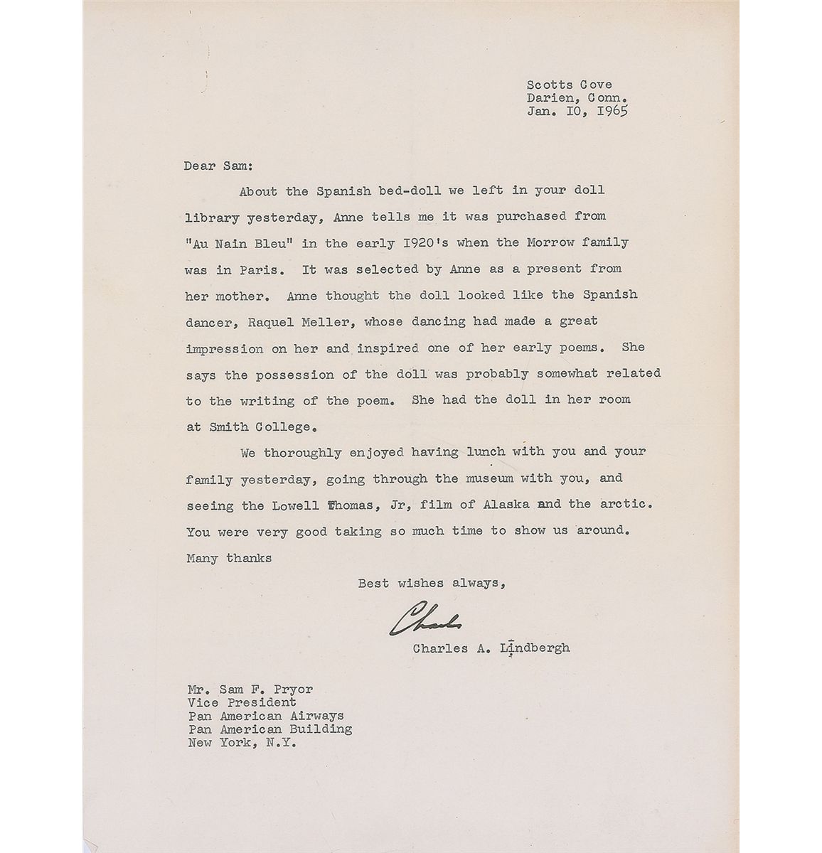 TLS signed “Charles,” one page, 8.5 x 11, January 10, 1965. Letter to Sam F. Pryor, vice president of Pan-American Airways. In part: “About the Spanish bed-doll we left in your doll library yesterday. Anne tells me it was purchased from ‘Au Nain Bleu’ in the early 1920s when the Morrow family was in Paris. It was selected by Anne as a present from her mother. Anne thought the doll looked like the Spanish dancer, Raquel Meller, whose dancing had made a great impression on her and inspired one of her early poems. She says the possession of the doll was probably somewhat related to the writing of the poem. She had the doll in her room at Smith College.” In fine condition, with central vertical and horizontal folds. Accompanied by a group of Lindbergh-related ephemera including five postcard photos, a copy of a flight log, a dinner program, two covers, and a letter from his son, Jon Lindbergh.