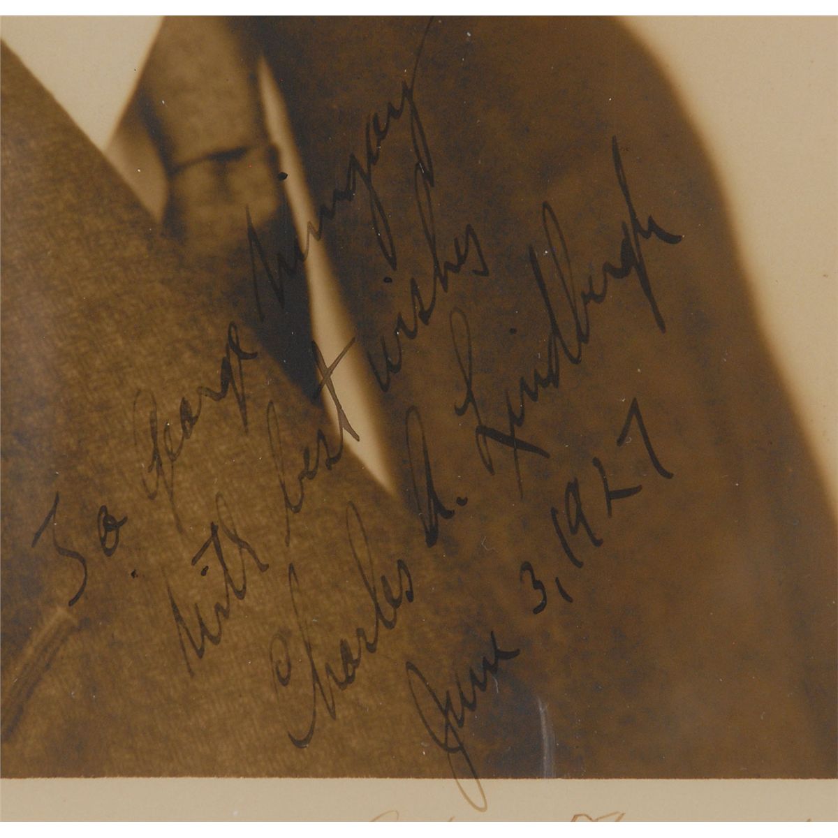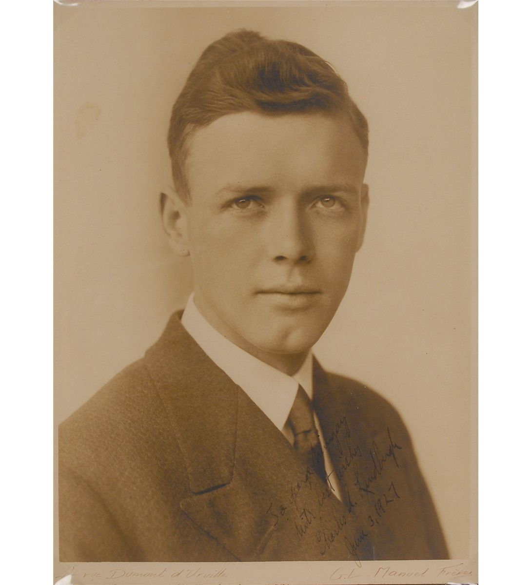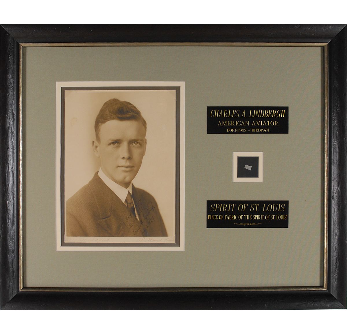 Exceptional set of items: first is a gorgeous matte-finish 8 x 11 formal portrait of the aviator in a handsome suit and tie, signed and inscribed in fountain pen just two weeks after his historic transatlantic flight, “To George Wingay, With best wishes, Charles A. Lindbergh, June 3, 1927.” Photographer’s notations in the lower border read: “7 rue Dumont d’Urville G. L. Manuel Freres.” Second is a small .5 x .25 swatch of fabric from the skin of his iconic airplane, the Spirit of St. Louis. Wonderfully double-matted and framed together with two engraved plaques to an overall size of 25 x 21. In overall fine condition, with somewhat light contrast to signature against his dark jacket. Upon his arrival in Paris on May 21, Lindbergh was received with unprecedented adulation and hailed an international hero. He remained in Europe for two weeks, making a series of brief flights and attending countless events in his honor, before beginning his trip back to the US on June 4. Signed on his final day in Paris, and accompanied by a piece of the plane that carried him across the Atlantic, this is a phenomenal piece of aviation history. Oversized.