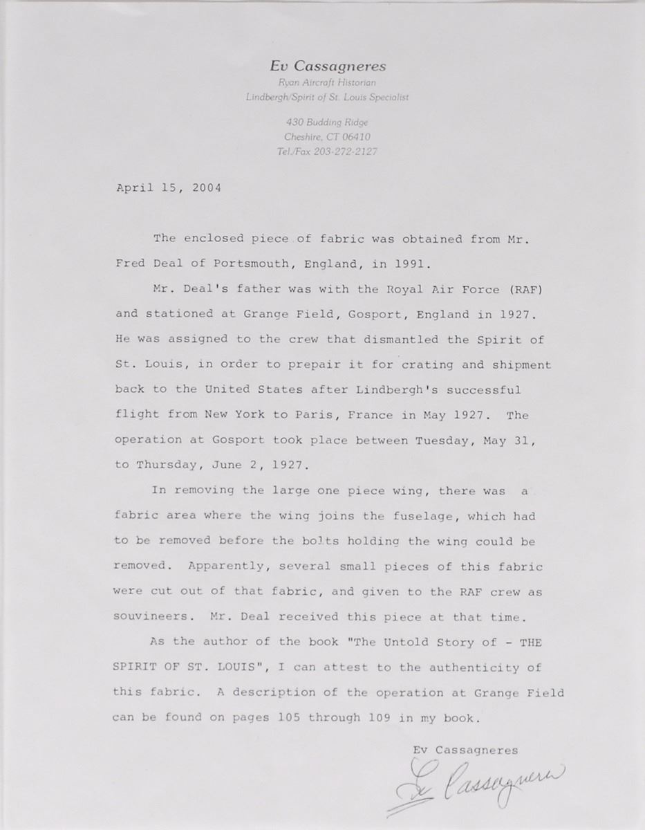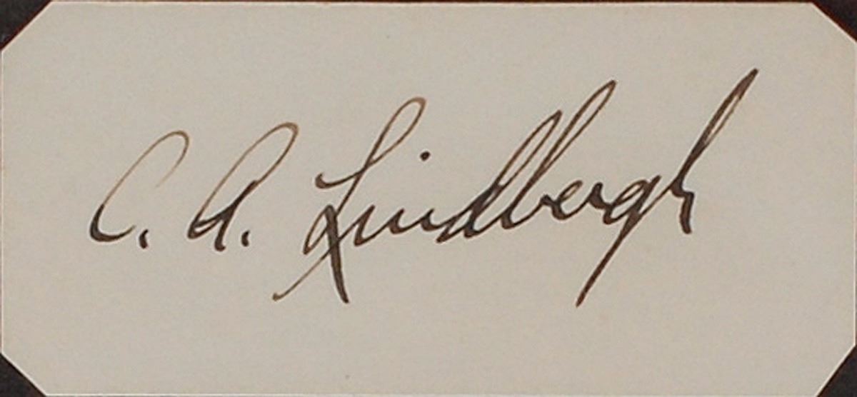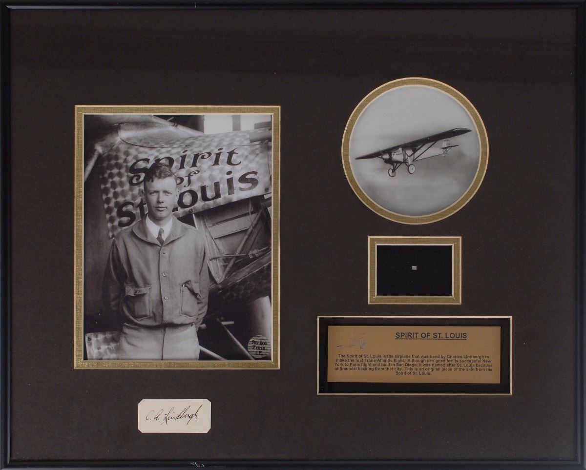 Two items: a fountain pen signature, “C. A. Lindbergh,” on an off-white 2.5 x 1 card; and an original piece of silver fabric taken from Lindbergh’s Spirit of St. Louis during disassembly following its historic 1927 transatlantic flight, measuring approximately 1/8? square. Both are mounted, matted, and framed with images of Lindbergh and his plane, and an engraved plaque to an overall size of 20.25 x 16.25. In overall fine condition. Fabric is accompanied by a photocopied letter of provenance from Lindbergh/Spirit of St. Louis Specialist Ev Cassagneres.