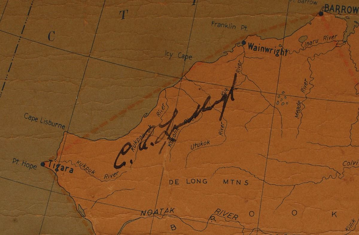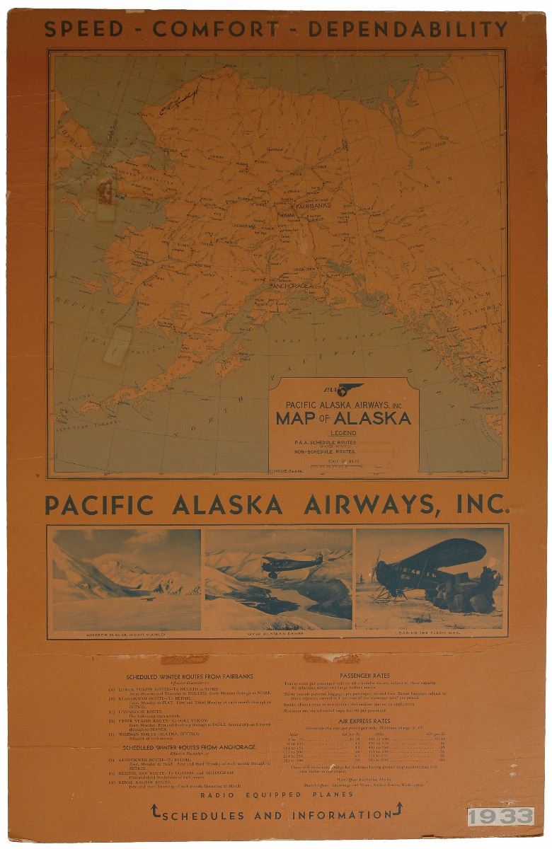 Impressive oversized 1933 poster for Pacific Alaska Airways, 21 x 32.5, signed in the upper left of the map near his air route between Barrow and Nome in fountain pen, “C. A. Lindbergh.” Affixed to a foamboard mount annotated on the reverse by a collector, “Owned and presented by Robert J. Gleason, who ‘radio equipped’ those planes.” In very good condition, with overall wrinkling and creasing, old tape repairs to lower fold and to small holes in the poster itself, and scattered staining. Oversized.