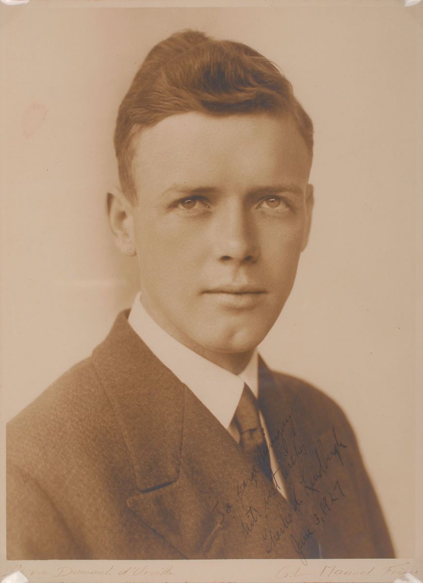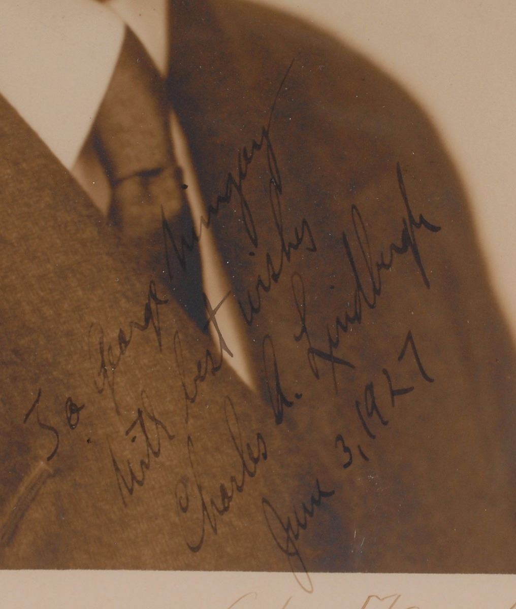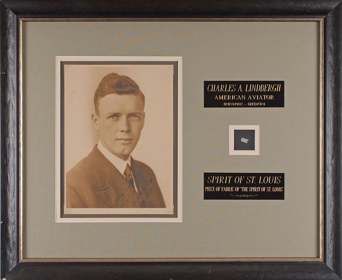 Exceptional pairing of items relating to Charles Lindbergh: first is a gorgeous matte-finish 8 x 11 formal portrait of the aviator in a handsome suit and tie, signed and inscribed in fountain pen just two weeks after his historic transatlantic flight, “To George Wingay, With best wishes, Charles A. Lindbergh, June 3, 1927.” Photographer’s notations in the lower border read, “7 rue Dumont d’Urville G. L. Manuel Freres.” Second is a small .5 x .25 swatch of silver fabric from the skin of his iconic airplane, the Spirit of St. Louis. Wonderfully double-matted and framed together with two engraved plaques to an overall size of 25 x 21. In overall fine condition, with somewhat light contrast to signature against his dark jacket. Upon his arrival in Paris on May 21, Lindbergh was received with unprecedented adulation and hailed as an international hero. He remained in Europe for two weeks, making a series of brief flights and attending countless events in his honor, before beginning his trip back to the US on June 4. Signed on his final day in Paris, and accompanied by a piece of the plane that carried him across the Atlantic Ocean, this is a phenomenal piece of aviation history. Oversized.