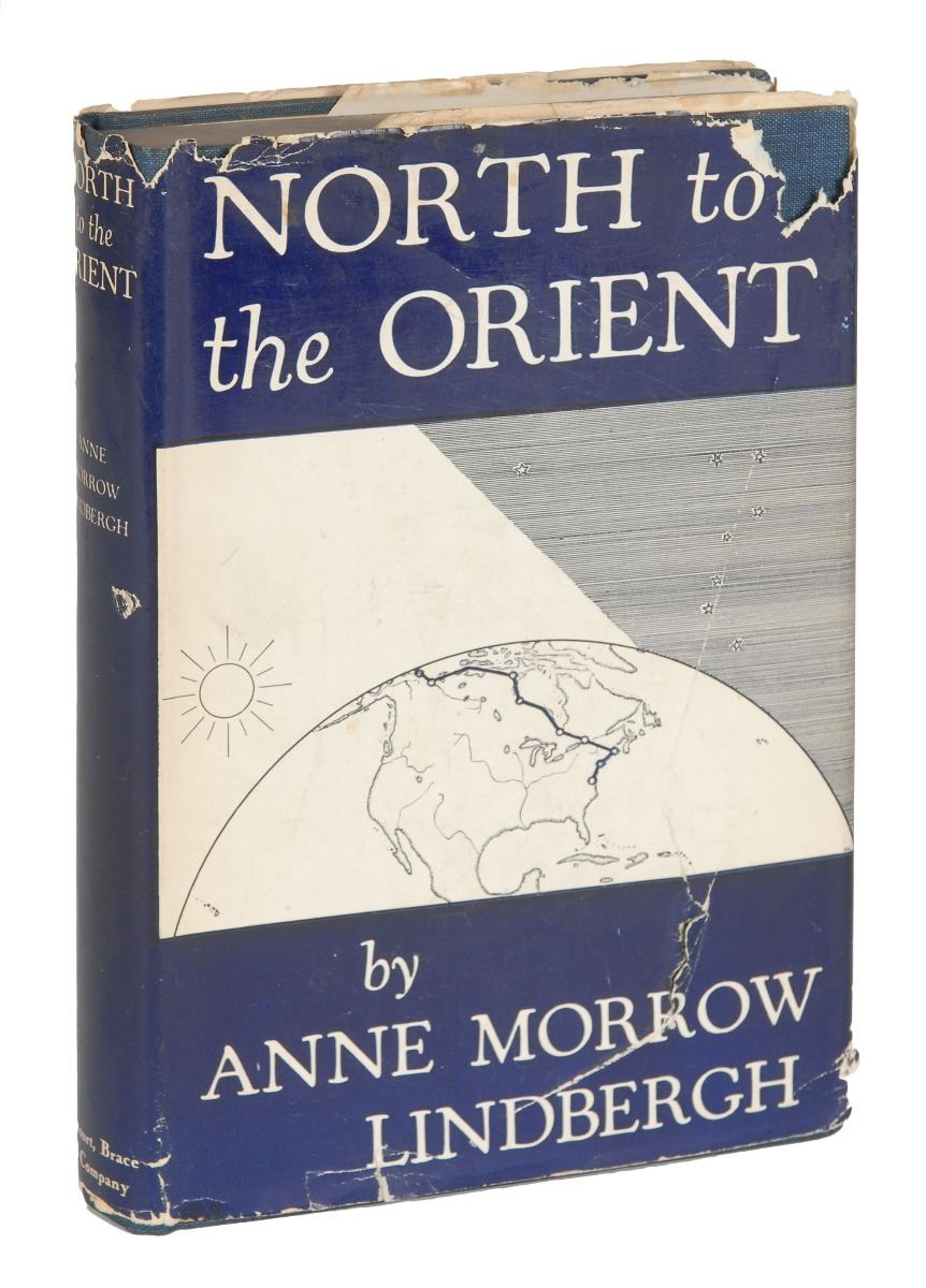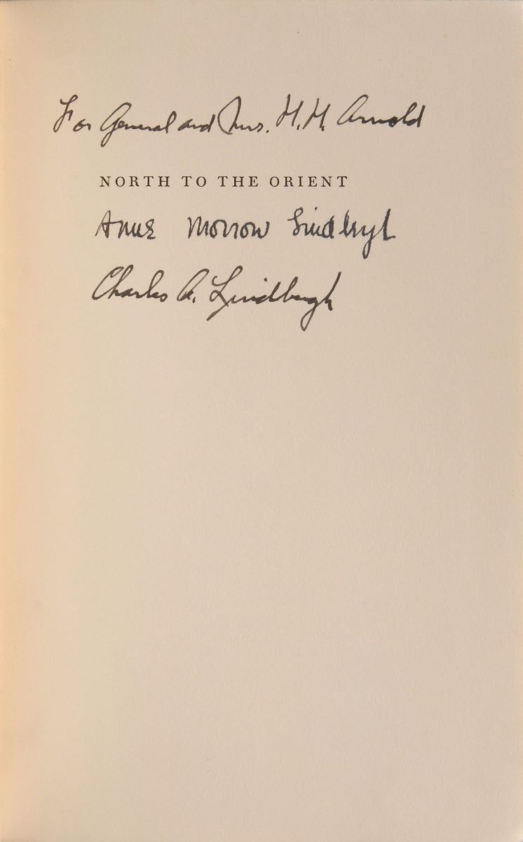 Signed book: North to the Orient. First edition. NY: Harcourt, Brace and Company, 1935. Hardcover with dust jacket, 5.75 x 8.25, 255 pages. Signed and inscribed on the half-title page in fountain pen, “For General and Mrs. H. H. Arnold, Charles A. Lindbergh” and “Anne Morrow Lindbergh.” Autographic condition: fine. Book condition: VG/G+.
