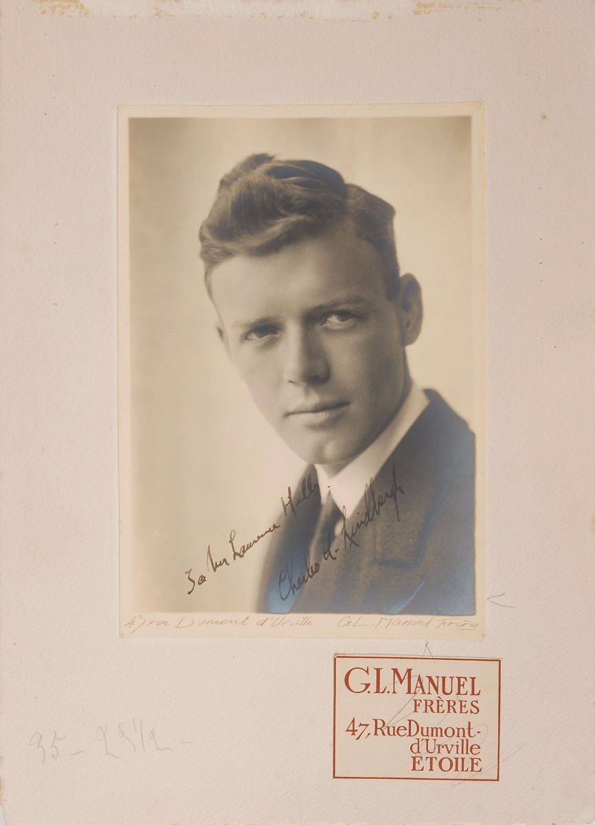 Striking vintage circa 1927 matte-finish 5.25 x 7.75 portrait by G. L. Manuel Freres, affixed to an 8.5 x 12 mount, signed and inscribed in fountain pen, "To Mr. Laurence Hills, Charles A. Lindbergh.” Signed by the studio in the lower margin; the mount also bears a G. L. Manuel Freres label. In fine condition, with light silvering to the image; the mount has surface loss along its top edge and a few random stray pencil marks. Pre-certified PSA/DNA.
