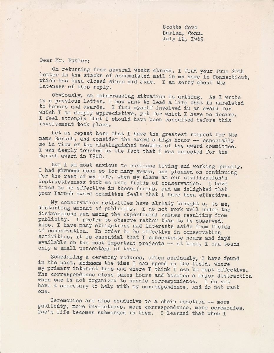 TLS, two pages, 8.5 x 11, July 12, 1969. Letter to Nelson Buhler concerning the Baruch award, in full: “On returning from several weeks abroad, I find your June 20th letter in the stacks of accumulated mail in my home in Connecticut, which has been closed since mid-June. I am sorry about the lateness of my reply. Obviously, an embarrassing situation is arising. As I wrote in a previous letter, I now want to lead a life that is unrelated to honors and awards. I find myself involved in an award for which I am deeply appreciative, yet for which I have no desire. I feel strongly that I should have been consulted before this involvement took place. Let me repeat here that I have the greatest respect for the name Baruch, and consider the award a high honor—especially so in view of the distinguished members of the award committee. I was deeply touched that I was selected for the Baruch award in 1968. But I am most anxious to continue living and working quietly. I had done so for many years, and planned on continuing for the rest of my life, when my alarm at our civilization’s destructiveness took me into fields of conservation. I have tried to be effective in these fields, and am delighted that your Baruch award committee feels that I have been effective. My conservation activities have already brought to me a, to me, disturbing amount of publicity. I do not work well under the distractions and among the superficial values resulting from publicity. I prefer to observe rather than to be observed. Also, I have many obligations and interests aside from fields of conservation. In order to be effective in conservation activities, it is essential that I concentrate hours and days available on the most important projects—at best, I can touch only a small percentage of them. Scheduling a ceremony reduces, often seriously, I have found in the past, the time I can spend in the field, where my primary interest lies and where I think I can be most effective. The correspondence alone takes hours and becomes a major distraction when one is not organized to handle correspondence. I do not have a secretary to help with my correspondence, and do not want one. Ceremonies are also conducive to a chain reaction—more publicity, more invitations, more correspondence, more ceremonies. One’s life becomes submerged in them. I learned that when I was concentrating my attention on fields of aviation, years ago. I am again in a position where further pressure is simply going to reduce flow. It is bound to result, as it did before, in withdrawal toward the core of my major interests where I can work quietly and effectively although without as quick results. My gratitude goes to you with this letter, but I must say once more that I am most anxious to avoid ceremonies of any kind, even though a White House presentation might be possible.” In very good to fine condition, with intersecting folds, overall light wrinkling, and staple holes to the upper left corner. Accompanied by the original mailing envelope. Pre-certified PSA/DNA.