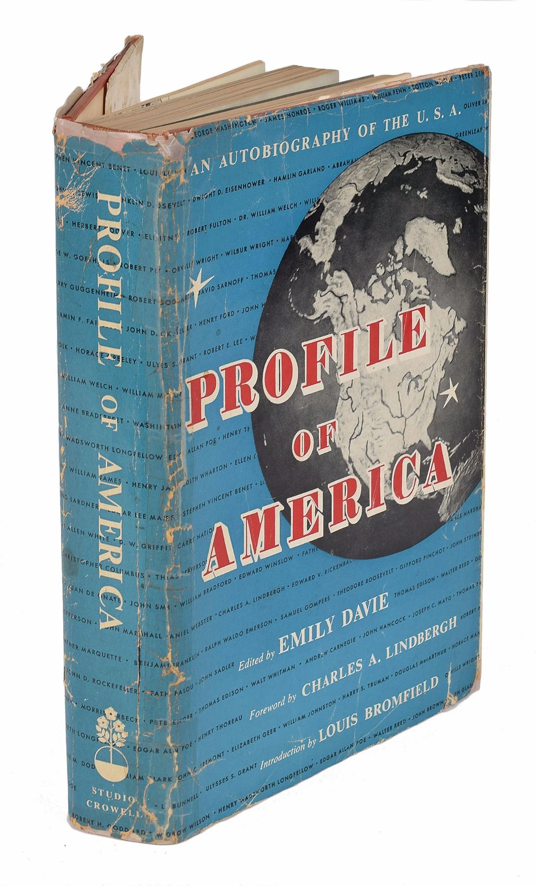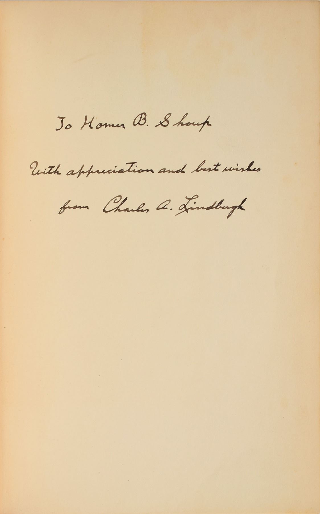Signed book: Profile of America. First edition, first printing. NY: Studio Publications, 1954. Hardcover with dust jacket, 7.25 x 10.25, 415 pages. Signed and inscribed on the first free end page in fountain pen, "To Homer B. Shoup, With appreciation and best wishes from Charles A. Lindbergh." In fine condition, with a hint of light toning to the signed page; the book itself is sound and in very good condition, however the dust jacket is in poor condition, held together with old scotch tape. Shoup was the family doctor of the Lindbergh family.