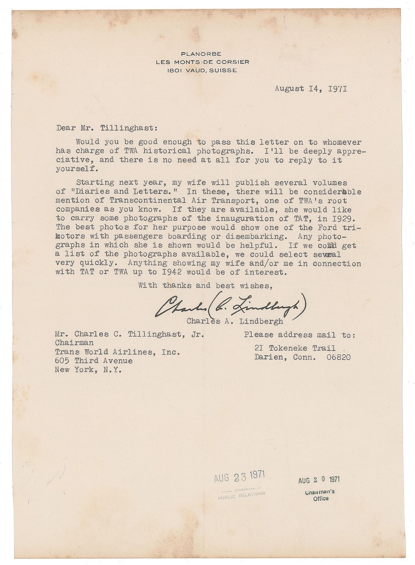 TLS signed “Charles (A. Lindbergh),” one page, 7.75 x 11, Planorbe letterhead, August 14, 1971. Letter to Charles C. Tillinghast, Jr., chairman of Trans World Airlines, in part: "Would you be good enough to pass this letter on to whomever has charge of TWA historical photographs…Starting next year, my wife will publish several volumes of 'Diaries and Letters,' In these, there will be considerable mention of Transcontinental Air Transport, one of TWA's root companies as you know. If they are available, she would like to carry some photographs of the inauguration of TAT, in 1929. The best photos for her purpose would show one of the Ford tri-motors with passengers boarding or disembarking. Any photographs in which she is shown would be helpful…Anything showing my wife and/or me in connection with TAT or TWA up to 1942 would be of interest." In very good to fine condition, with light staining to the top and bottom edges, and a thin strip of mounting tape along the top edge. Accompanied by a full letter of authenticity from PSA/DNA.
