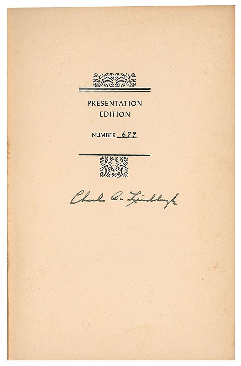 Signed book: The Spirit of St. Louis. Limited presentation edition, number 679. NY: Charles Scribner's Sons, 1953. Hardcover, 5.75 x 8.5, 562 pages. Signed on the colophon in fountain pen, "Charles A. Lindbergh." Autographic condition: fine. Book condition VG+/None. A most attractive example of this high point of aviation literature.
